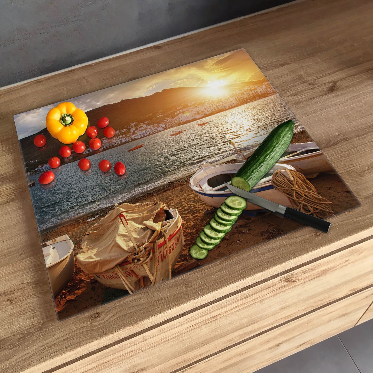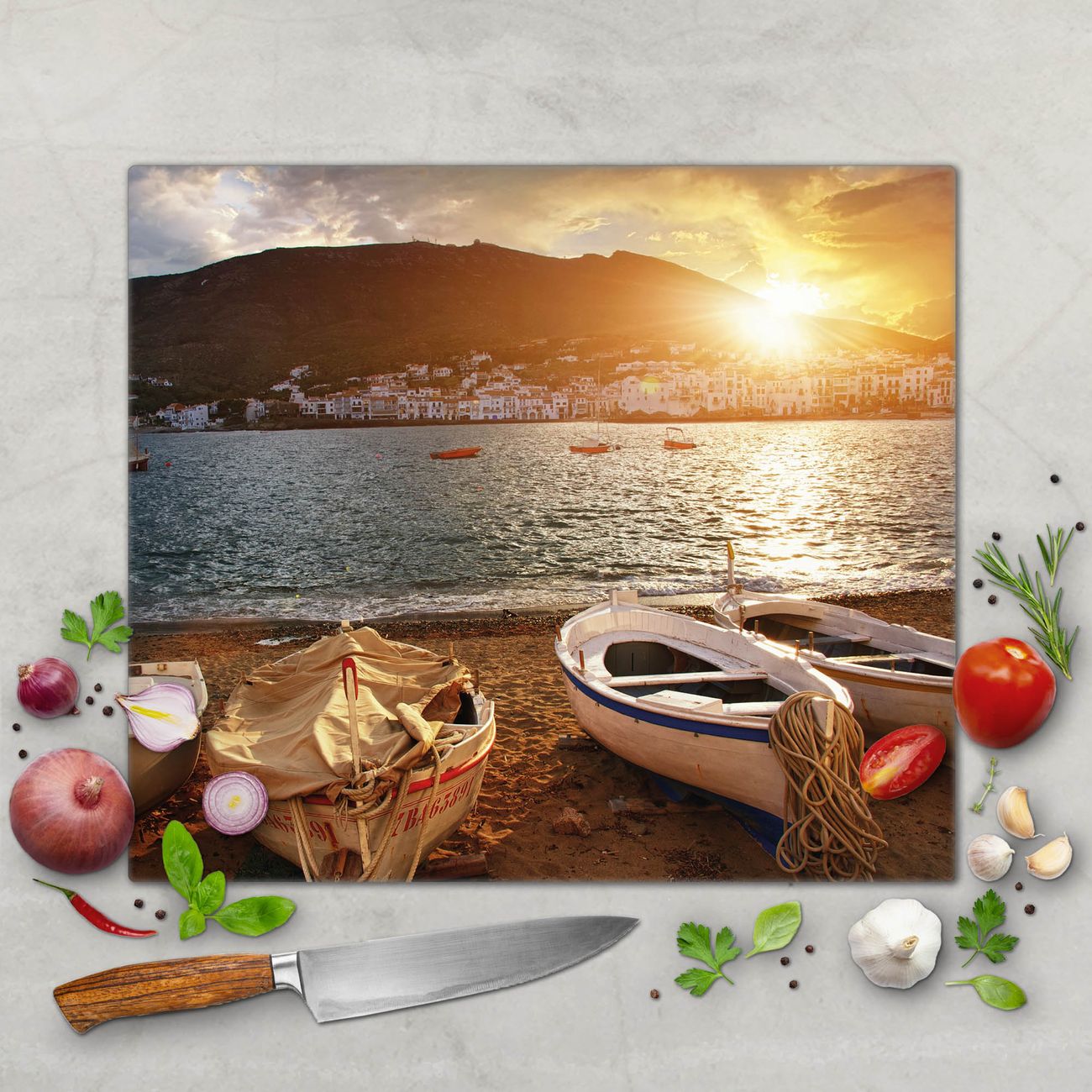 FUNKTION: Das banjado Schneidebrett mit Motiv Fischerboote ist groß und rutschfest und damit ideal für Ihre Küche. Besonders praktisch. Das Schneidebrett ist vielseitig einsetzbar: ob als Spritzschutz hinter dem Herd für Ihre Küche oder als Glas Schneidebrett als hygienische und geruchsneutrale Unterlage. Sie können ebenfalls heiße Töpfe und Pfannen bis 100°C auf der Herdplattenabdeckung abstellen. Sie erhalten ein Multitalent für Ihre Küche. QUALITÄT: Die Schneideplatte Glas besteht aus hochwertigem, gehärtetem und hitzebeständigem Glas. Wählen Sie aus einem unserer zahlreichen Motive das passende Design für Ihre Küche aus. DETAILS: Das Schneidebrett Glas groß ist in verschiedenen Größen verfügbar. Sie erhalten separate Gumminoppen damit Ihr großes Schneidebrett rutschfest in der Küche steht. VIELSEITIG: Das Schneidebrett modern ist ein Allrounder - als Schneideunterlage Küche direkt auf dem Herd oder separat und als Spritzschutz an der Wand aufgestellt - ein praktisches Küchenutensil. BANJADO: Auf Wunsch fertigen wir das Glas Schneide Brett auch als Sondergröße an. Mehrteilige Platten sind auch möglich. Kontaktieren Sie uns gern für eine Spezialanfertigung Ihrer Glasplatte Küche.