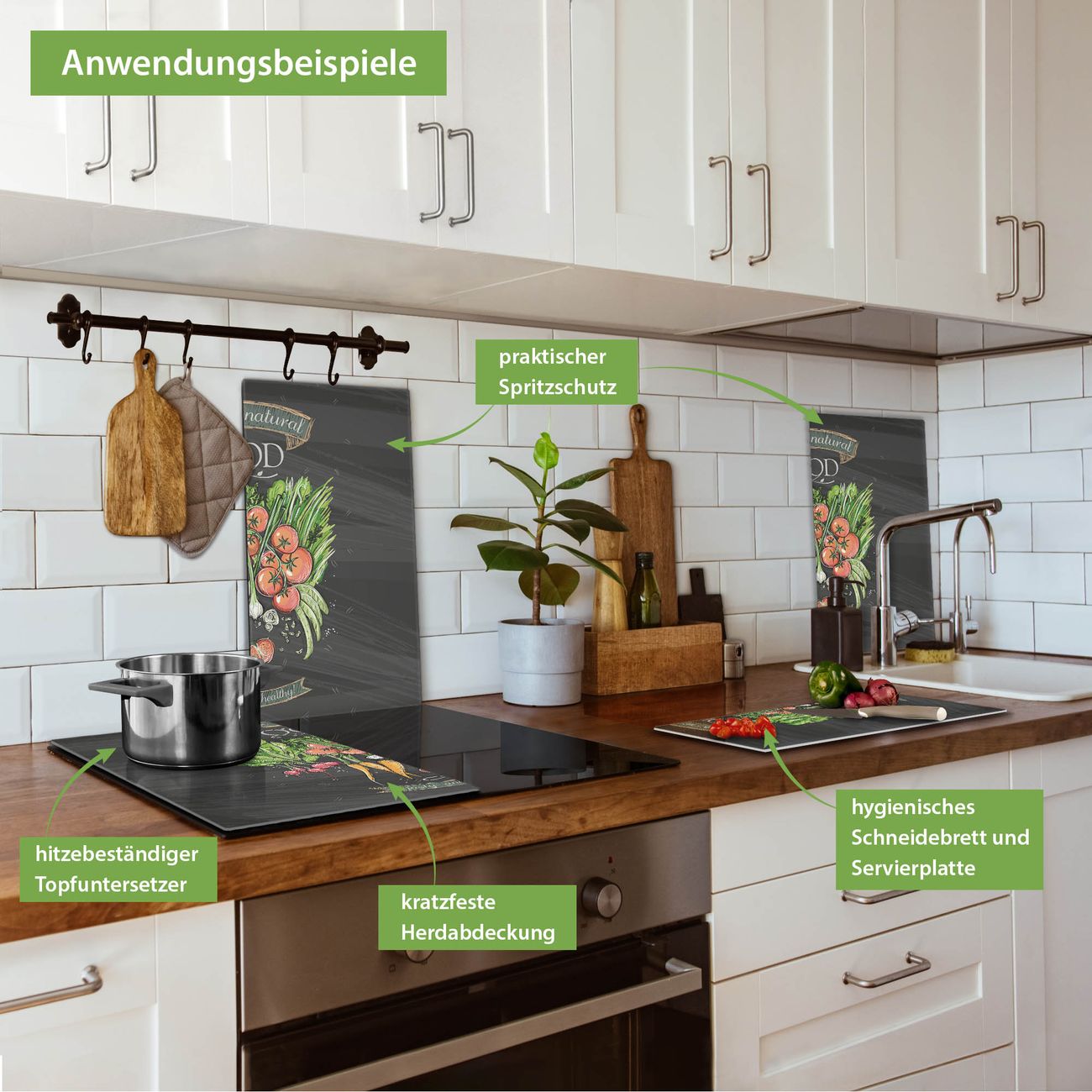FUNKTION: Das banjado Schneidebrett mit Motiv Gesund Und Lecker ist groß und rutschfest und damit ideal für Ihre Küche. Besonders praktisch. Das Schneidebrett ist vielseitig einsetzbar: ob als Spritzschutz hinter dem Herd für Ihre Küche oder als Glas Schneidebrett als hygienische und geruchsneutrale Unterlage. Sie können ebenfalls heiße Töpfe und Pfannen bis 100°C auf der Herdplattenabdeckung abstellen. Sie erhalten ein Multitalent für Ihre Küche. QUALITÄT: Die Schneideplatte Glas besteht aus hochwertigem, gehärtetem und hitzebeständigem Glas. Wählen Sie aus einem unserer zahlreichen Motive das passende Design für Ihre Küche aus. DETAILS: Das Schneidebrett Glas groß ist in verschiedenen Größen verfügbar. Sie erhalten separate Gumminoppen damit Ihr großes Schneidebrett rutschfest in der Küche steht. VIELSEITIG: Das Schneidebrett modern ist ein Allrounder - als Schneideunterlage Küche direkt auf dem Herd oder separat und als Spritzschutz an der Wand aufgestellt - ein praktisches Küchenutensil. BANJADO: Auf Wunsch fertigen wir das Glas Schneide Brett auch als Sondergröße an. Mehrteilige Platten sind auch möglich. Kontaktieren Sie uns gern für eine Spezialanfertigung Ihrer Glasplatte Küche.