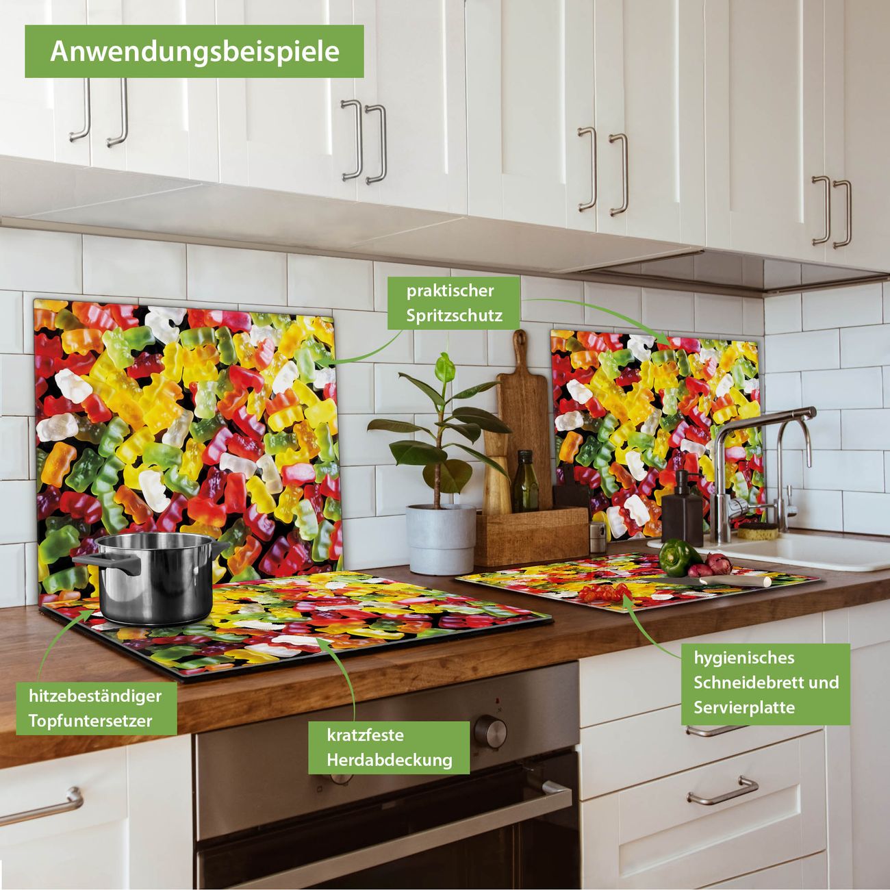 FUNKTION: Das banjado Schneidebrett mit Motiv Gummibaerchen ist groß und rutschfest und damit ideal für Ihre Küche. Besonders praktisch. Das Schneidebrett ist vielseitig einsetzbar: ob als Spritzschutz hinter dem Herd für Ihre Küche oder als Glas Schneidebrett als hygienische und geruchsneutrale Unterlage. Sie können ebenfalls heiße Töpfe und Pfannen bis 100°C auf der Herdplattenabdeckung abstellen. Sie erhalten ein Multitalent für Ihre Küche. QUALITÄT: Die Schneideplatte Glas besteht aus hochwertigem, gehärtetem und hitzebeständigem Glas. Wählen Sie aus einem unserer zahlreichen Motive das passende Design für Ihre Küche aus. DETAILS: Das Schneidebrett Glas groß ist in verschiedenen Größen verfügbar. Sie erhalten separate Gumminoppen damit Ihr großes Schneidebrett rutschfest in der Küche steht. VIELSEITIG: Das Schneidebrett modern ist ein Allrounder - als Schneideunterlage Küche direkt auf dem Herd oder separat und als Spritzschutz an der Wand aufgestellt - ein praktisches Küchenutensil. BANJADO: Auf Wunsch fertigen wir das Glas Schneide Brett auch als Sondergröße an. Mehrteilige Platten sind auch möglich. Kontaktieren Sie uns gern für eine Spezialanfertigung Ihrer Glasplatte Küche.