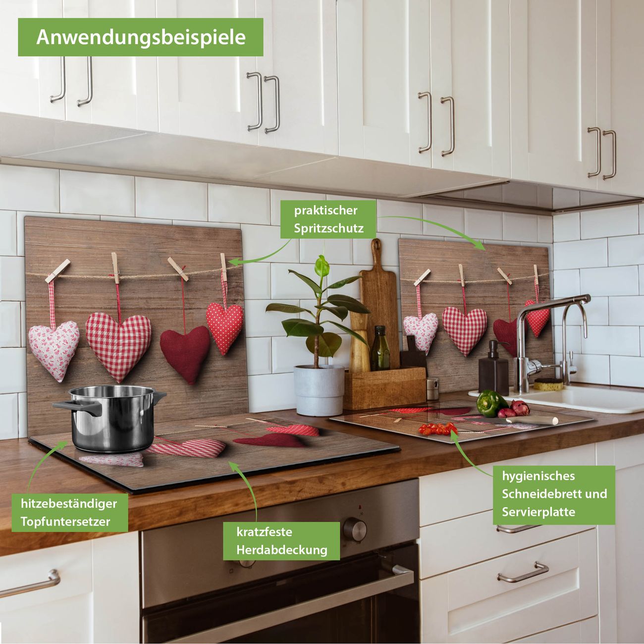 FUNKTION: Das banjado Schneidebrett mit Motiv Herzen ist groß und rutschfest und damit ideal für Ihre Küche. Besonders praktisch. Das Schneidebrett ist vielseitig einsetzbar: ob als Spritzschutz hinter dem Herd für Ihre Küche oder als Glas Schneidebrett als hygienische und geruchsneutrale Unterlage. Sie können ebenfalls heiße Töpfe und Pfannen bis 100°C auf der Herdplattenabdeckung abstellen. Sie erhalten ein Multitalent für Ihre Küche. QUALITÄT: Die Schneideplatte Glas besteht aus hochwertigem, gehärtetem und hitzebeständigem Glas. Wählen Sie aus einem unserer zahlreichen Motive das passende Design für Ihre Küche aus. DETAILS: Das Schneidebrett Glas groß ist in verschiedenen Größen verfügbar. Sie erhalten separate Gumminoppen damit Ihr großes Schneidebrett rutschfest in der Küche steht. VIELSEITIG: Das Schneidebrett modern ist ein Allrounder - als Schneideunterlage Küche direkt auf dem Herd oder separat und als Spritzschutz an der Wand aufgestellt - ein praktisches Küchenutensil. BANJADO: Auf Wunsch fertigen wir das Glas Schneide Brett auch als Sondergröße an. Mehrteilige Platten sind auch möglich. Kontaktieren Sie uns gern für eine Spezialanfertigung Ihrer Glasplatte Küche.
