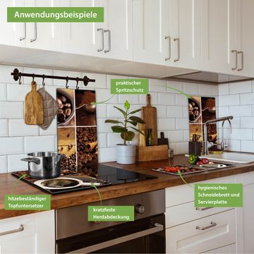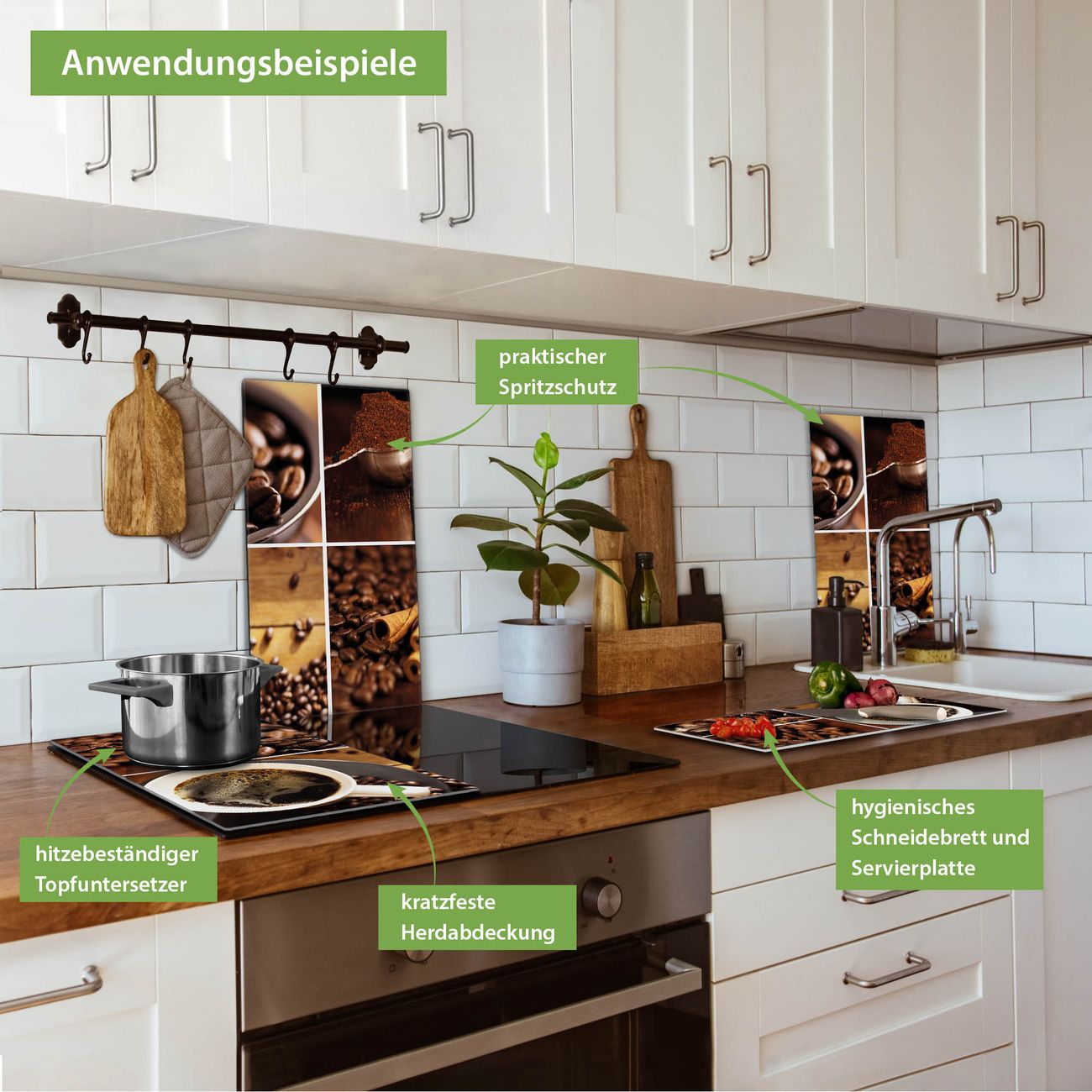 FUNKTION: Das banjado Schneidebrett mit Motiv Kaffee&Schokolade ist groß und rutschfest und damit ideal für Ihre Küche. Besonders praktisch. Das Schneidebrett ist vielseitig einsetzbar: ob als Spritzschutz hinter dem Herd für Ihre Küche oder als Glas Schneidebrett als hygienische und geruchsneutrale Unterlage. Sie können ebenfalls heiße Töpfe und Pfannen bis 100°C auf der Herdplattenabdeckung abstellen. Sie erhalten ein Multitalent für Ihre Küche. QUALITÄT: Die Schneideplatte Glas besteht aus hochwertigem, gehärtetem und hitzebeständigem Glas. Wählen Sie aus einem unserer zahlreichen Motive das passende Design für Ihre Küche aus. DETAILS: Das Schneidebrett Glas groß ist in verschiedenen Größen verfügbar. Sie erhalten separate Gumminoppen damit Ihr großes Schneidebrett rutschfest in der Küche steht. VIELSEITIG: Das Schneidebrett modern ist ein Allrounder - als Schneideunterlage Küche direkt auf dem Herd oder separat und als Spritzschutz an der Wand aufgestellt - ein praktisches Küchenutensil. BANJADO: Auf Wunsch fertigen wir das Glas Schneide Brett auch als Sondergröße an. Mehrteilige Platten sind auch möglich. Kontaktieren Sie uns gern für eine Spezialanfertigung Ihrer Glasplatte Küche.