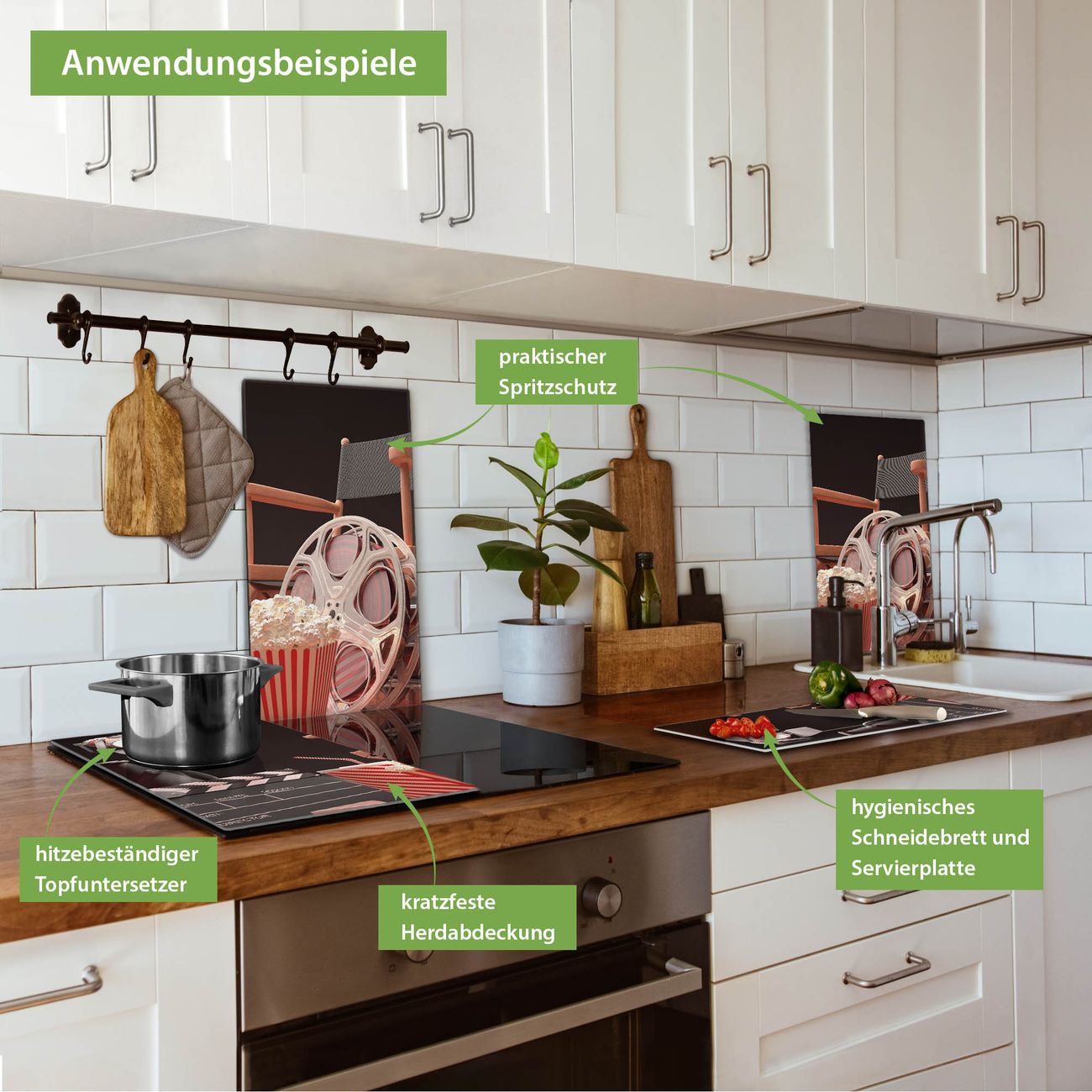 FUNKTION: Das banjado Schneidebrett mit Motiv Kino ist groß und rutschfest und damit ideal für Ihre Küche. Besonders praktisch. Das Schneidebrett ist vielseitig einsetzbar: ob als Spritzschutz hinter dem Herd für Ihre Küche oder als Glas Schneidebrett als hygienische und geruchsneutrale Unterlage. Sie können ebenfalls heiße Töpfe und Pfannen bis 100°C auf der Herdplattenabdeckung abstellen. Sie erhalten ein Multitalent für Ihre Küche. QUALITÄT: Die Schneideplatte Glas besteht aus hochwertigem, gehärtetem und hitzebeständigem Glas. Wählen Sie aus einem unserer zahlreichen Motive das passende Design für Ihre Küche aus. DETAILS: Das Schneidebrett Glas groß ist in verschiedenen Größen verfügbar. Sie erhalten separate Gumminoppen damit Ihr großes Schneidebrett rutschfest in der Küche steht. VIELSEITIG: Das Schneidebrett modern ist ein Allrounder - als Schneideunterlage Küche direkt auf dem Herd oder separat und als Spritzschutz an der Wand aufgestellt - ein praktisches Küchenutensil. BANJADO: Auf Wunsch fertigen wir das Glas Schneide Brett auch als Sondergröße an. Mehrteilige Platten sind auch möglich. Kontaktieren Sie uns gern für eine Spezialanfertigung Ihrer Glasplatte Küche.