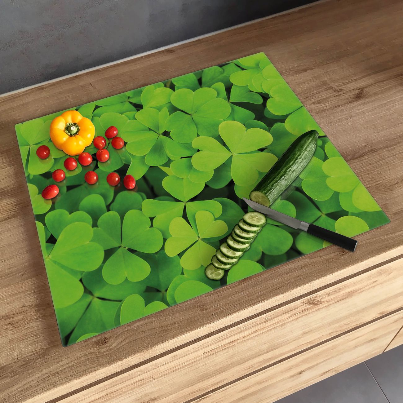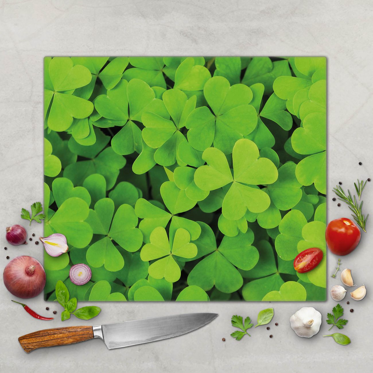 FUNKTION: Das banjado Schneidebrett mit Motiv Klee ist groß und rutschfest und damit ideal für Ihre Küche. Besonders praktisch. Das Schneidebrett ist vielseitig einsetzbar: ob als Spritzschutz hinter dem Herd für Ihre Küche oder als Glas Schneidebrett als hygienische und geruchsneutrale Unterlage. Sie können ebenfalls heiße Töpfe und Pfannen bis 100°C auf der Herdplattenabdeckung abstellen. Sie erhalten ein Multitalent für Ihre Küche. QUALITÄT: Die Schneideplatte Glas besteht aus hochwertigem, gehärtetem und hitzebeständigem Glas. Wählen Sie aus einem unserer zahlreichen Motive das passende Design für Ihre Küche aus. DETAILS: Das Schneidebrett Glas groß ist in verschiedenen Größen verfügbar. Sie erhalten separate Gumminoppen damit Ihr großes Schneidebrett rutschfest in der Küche steht. VIELSEITIG: Das Schneidebrett modern ist ein Allrounder - als Schneideunterlage Küche direkt auf dem Herd oder separat und als Spritzschutz an der Wand aufgestellt - ein praktisches Küchenutensil. BANJADO: Auf Wunsch fertigen wir das Glas Schneide Brett auch als Sondergröße an. Mehrteilige Platten sind auch möglich. Kontaktieren Sie uns gern für eine Spezialanfertigung Ihrer Glasplatte Küche.