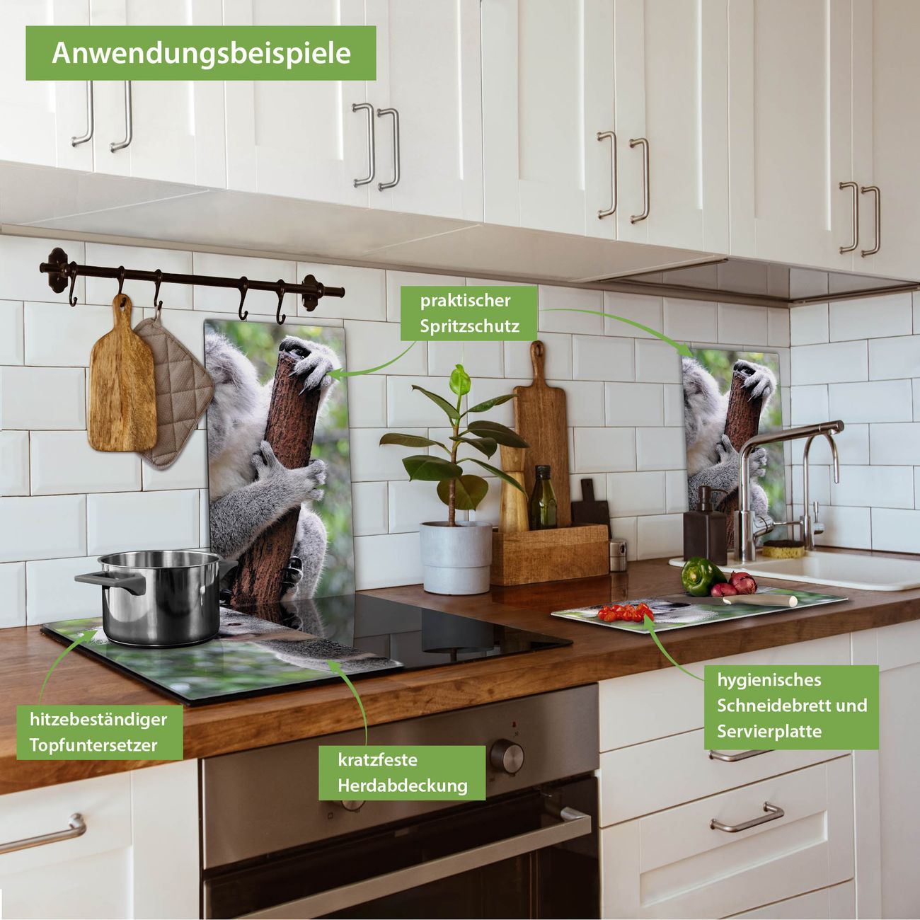 FUNKTION: Das banjado Schneidebrett mit Motiv Koala ist groß und rutschfest und damit ideal für Ihre Küche. Besonders praktisch. Das Schneidebrett ist vielseitig einsetzbar: ob als Spritzschutz hinter dem Herd für Ihre Küche oder als Glas Schneidebrett als hygienische und geruchsneutrale Unterlage. Sie können ebenfalls heiße Töpfe und Pfannen bis 100°C auf der Herdplattenabdeckung abstellen. Sie erhalten ein Multitalent für Ihre Küche. QUALITÄT: Die Schneideplatte Glas besteht aus hochwertigem, gehärtetem und hitzebeständigem Glas. Wählen Sie aus einem unserer zahlreichen Motive das passende Design für Ihre Küche aus. DETAILS: Das Schneidebrett Glas groß ist in verschiedenen Größen verfügbar. Sie erhalten separate Gumminoppen damit Ihr großes Schneidebrett rutschfest in der Küche steht. VIELSEITIG: Das Schneidebrett modern ist ein Allrounder - als Schneideunterlage Küche direkt auf dem Herd oder separat und als Spritzschutz an der Wand aufgestellt - ein praktisches Küchenutensil. BANJADO: Auf Wunsch fertigen wir das Glas Schneide Brett auch als Sondergröße an. Mehrteilige Platten sind auch möglich. Kontaktieren Sie uns gern für eine Spezialanfertigung Ihrer Glasplatte Küche.