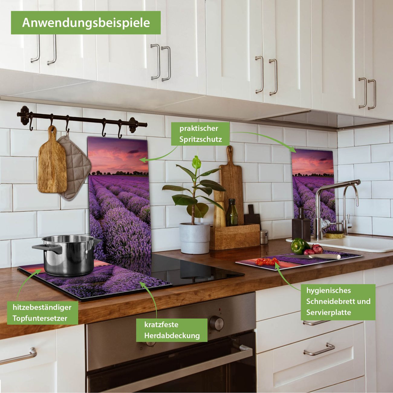FUNKTION: Das banjado Schneidebrett mit Motiv Lavendelfeld ist groß und rutschfest und damit ideal für Ihre Küche. Besonders praktisch. Das Schneidebrett ist vielseitig einsetzbar: ob als Spritzschutz hinter dem Herd für Ihre Küche oder als Glas Schneidebrett als hygienische und geruchsneutrale Unterlage. Sie können ebenfalls heiße Töpfe und Pfannen bis 100°C auf der Herdplattenabdeckung abstellen. Sie erhalten ein Multitalent für Ihre Küche. QUALITÄT: Die Schneideplatte Glas besteht aus hochwertigem, gehärtetem und hitzebeständigem Glas. Wählen Sie aus einem unserer zahlreichen Motive das passende Design für Ihre Küche aus. DETAILS: Das Schneidebrett Glas groß ist in verschiedenen Größen verfügbar. Sie erhalten separate Gumminoppen damit Ihr großes Schneidebrett rutschfest in der Küche steht. VIELSEITIG: Das Schneidebrett modern ist ein Allrounder - als Schneideunterlage Küche direkt auf dem Herd oder separat und als Spritzschutz an der Wand aufgestellt - ein praktisches Küchenutensil. BANJADO: Auf Wunsch fertigen wir das Glas Schneide Brett auch als Sondergröße an. Mehrteilige Platten sind auch möglich. Kontaktieren Sie uns gern für eine Spezialanfertigung Ihrer Glasplatte Küche.