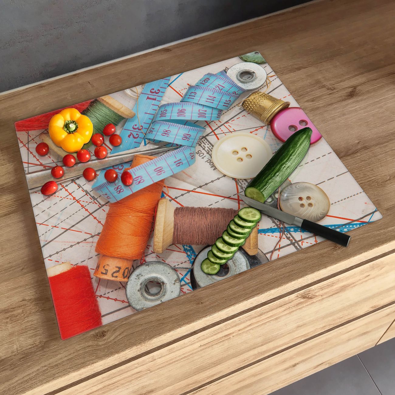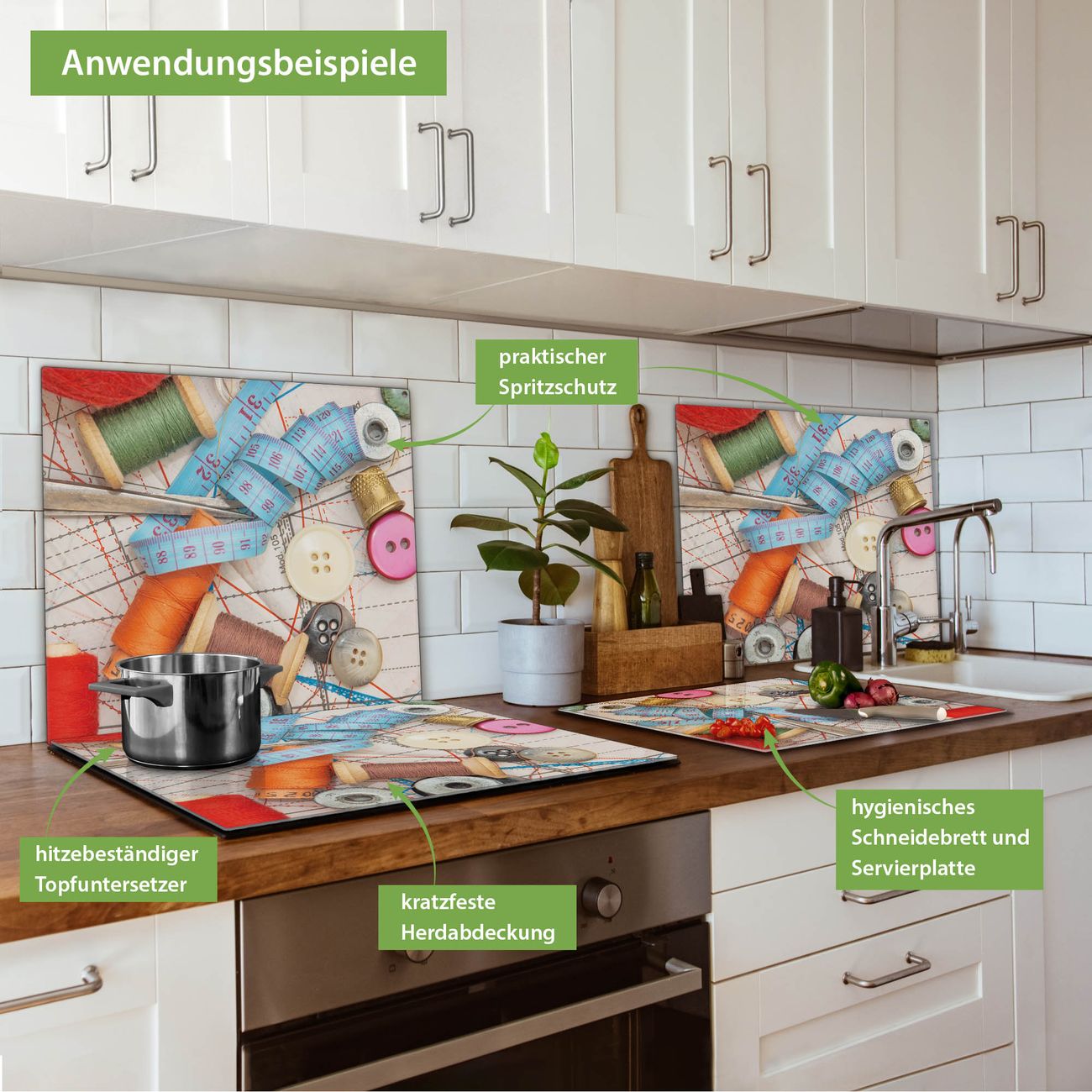 FUNKTION: Das banjado Schneidebrett mit Motiv Nähen ist groß und rutschfest und damit ideal für Ihre Küche. Besonders praktisch. Das Schneidebrett ist vielseitig einsetzbar: ob als Spritzschutz hinter dem Herd für Ihre Küche oder als Glas Schneidebrett als hygienische und geruchsneutrale Unterlage. Sie können ebenfalls heiße Töpfe und Pfannen bis 100°C auf der Herdplattenabdeckung abstellen. Sie erhalten ein Multitalent für Ihre Küche. QUALITÄT: Die Schneideplatte Glas besteht aus hochwertigem, gehärtetem und hitzebeständigem Glas. Wählen Sie aus einem unserer zahlreichen Motive das passende Design für Ihre Küche aus. DETAILS: Das Schneidebrett Glas groß ist in verschiedenen Größen verfügbar. Sie erhalten separate Gumminoppen damit Ihr großes Schneidebrett rutschfest in der Küche steht. VIELSEITIG: Das Schneidebrett modern ist ein Allrounder - als Schneideunterlage Küche direkt auf dem Herd oder separat und als Spritzschutz an der Wand aufgestellt - ein praktisches Küchenutensil. BANJADO: Auf Wunsch fertigen wir das Glas Schneide Brett auch als Sondergröße an. Mehrteilige Platten sind auch möglich. Kontaktieren Sie uns gern für eine Spezialanfertigung Ihrer Glasplatte Küche.