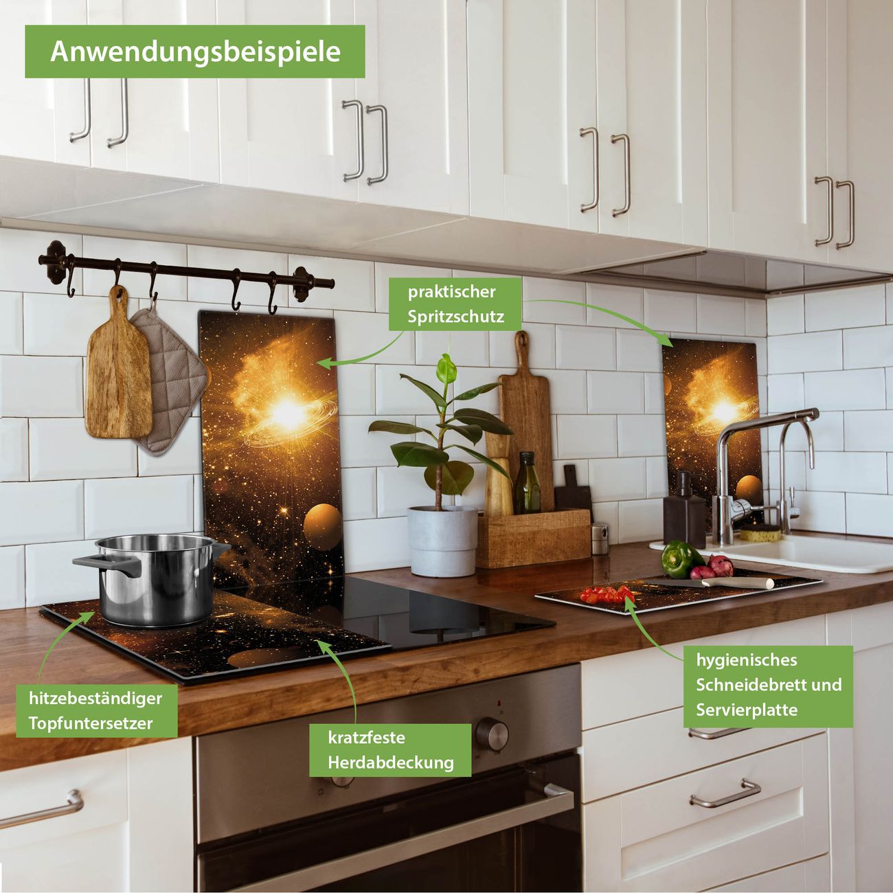 FUNKTION: Das banjado Schneidebrett mit Motiv Outer Space ist groß und rutschfest und damit ideal für Ihre Küche. Besonders praktisch. Das Schneidebrett ist vielseitig einsetzbar: ob als Spritzschutz hinter dem Herd für Ihre Küche oder als Glas Schneidebrett als hygienische und geruchsneutrale Unterlage. Sie können ebenfalls heiße Töpfe und Pfannen bis 100°C auf der Herdplattenabdeckung abstellen. Sie erhalten ein Multitalent für Ihre Küche. QUALITÄT: Die Schneideplatte Glas besteht aus hochwertigem, gehärtetem und hitzebeständigem Glas. Wählen Sie aus einem unserer zahlreichen Motive das passende Design für Ihre Küche aus. DETAILS: Das Schneidebrett Glas groß ist in verschiedenen Größen verfügbar. Sie erhalten separate Gumminoppen damit Ihr großes Schneidebrett rutschfest in der Küche steht. VIELSEITIG: Das Schneidebrett modern ist ein Allrounder - als Schneideunterlage Küche direkt auf dem Herd oder separat und als Spritzschutz an der Wand aufgestellt - ein praktisches Küchenutensil. BANJADO: Auf Wunsch fertigen wir das Glas Schneide Brett auch als Sondergröße an. Mehrteilige Platten sind auch möglich. Kontaktieren Sie uns gern für eine Spezialanfertigung Ihrer Glasplatte Küche.