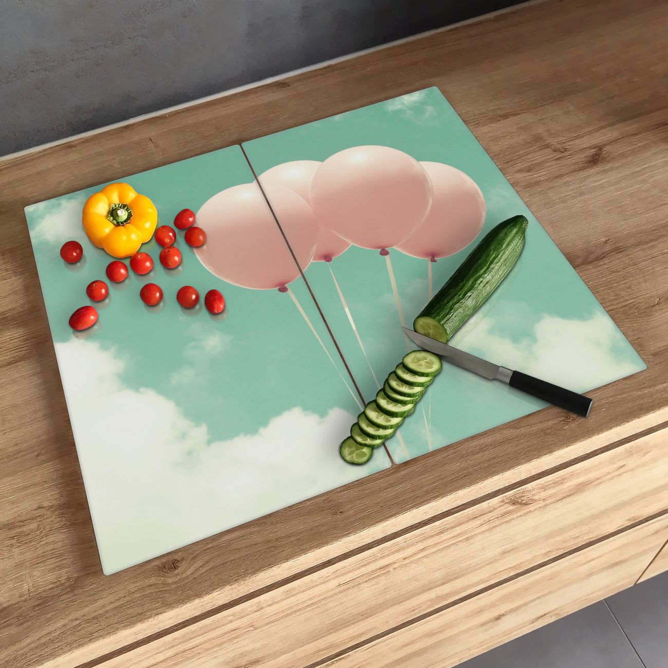 FUNKTION: Das banjado Schneidebrett mit Motiv Rosa Ballons ist groß und rutschfest und damit ideal für Ihre Küche. Besonders praktisch. Das Schneidebrett ist vielseitig einsetzbar: ob als Spritzschutz hinter dem Herd für Ihre Küche oder als Glas Schneidebrett als hygienische und geruchsneutrale Unterlage. Sie können ebenfalls heiße Töpfe und Pfannen bis 100°C auf der Herdplattenabdeckung abstellen. Sie erhalten ein Multitalent für Ihre Küche. QUALITÄT: Die Schneideplatte Glas besteht aus hochwertigem, gehärtetem und hitzebeständigem Glas. Wählen Sie aus einem unserer zahlreichen Motive das passende Design für Ihre Küche aus. DETAILS: Das Schneidebrett Glas groß ist in verschiedenen Größen verfügbar. Sie erhalten separate Gumminoppen damit Ihr großes Schneidebrett rutschfest in der Küche steht. VIELSEITIG: Das Schneidebrett modern ist ein Allrounder - als Schneideunterlage Küche direkt auf dem Herd oder separat und als Spritzschutz an der Wand aufgestellt - ein praktisches Küchenutensil. BANJADO: Auf Wunsch fertigen wir das Glas Schneide Brett auch als Sondergröße an. Mehrteilige Platten sind auch möglich. Kontaktieren Sie uns gern für eine Spezialanfertigung Ihrer Glasplatte Küche.