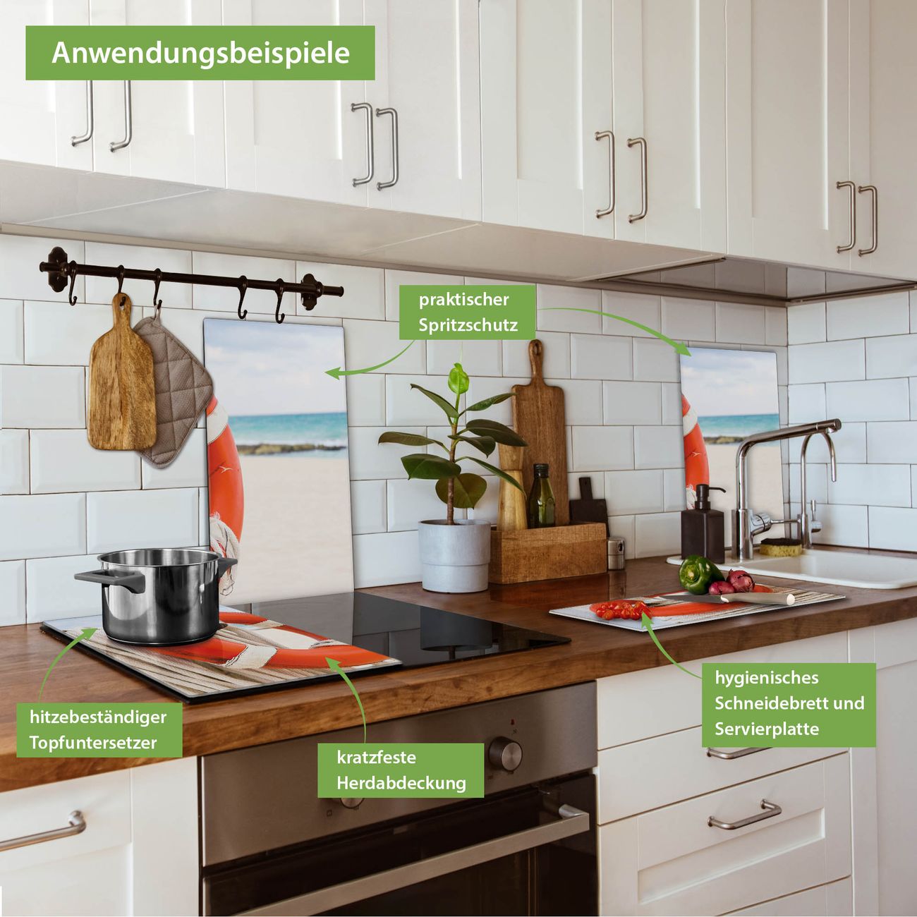 FUNKTION: Das banjado Schneidebrett mit Motiv Roter Rettungsring ist groß und rutschfest und damit ideal für Ihre Küche. Besonders praktisch. Das Schneidebrett ist vielseitig einsetzbar: ob als Spritzschutz hinter dem Herd für Ihre Küche oder als Glas Schneidebrett als hygienische und geruchsneutrale Unterlage. Sie können ebenfalls heiße Töpfe und Pfannen bis 100°C auf der Herdplattenabdeckung abstellen. Sie erhalten ein Multitalent für Ihre Küche. QUALITÄT: Die Schneideplatte Glas besteht aus hochwertigem, gehärtetem und hitzebeständigem Glas. Wählen Sie aus einem unserer zahlreichen Motive das passende Design für Ihre Küche aus. DETAILS: Das Schneidebrett Glas groß ist in verschiedenen Größen verfügbar. Sie erhalten separate Gumminoppen damit Ihr großes Schneidebrett rutschfest in der Küche steht. VIELSEITIG: Das Schneidebrett modern ist ein Allrounder - als Schneideunterlage Küche direkt auf dem Herd oder separat und als Spritzschutz an der Wand aufgestellt - ein praktisches Küchenutensil. BANJADO: Auf Wunsch fertigen wir das Glas Schneide Brett auch als Sondergröße an. Mehrteilige Platten sind auch möglich. Kontaktieren Sie uns gern für eine Spezialanfertigung Ihrer Glasplatte Küche.