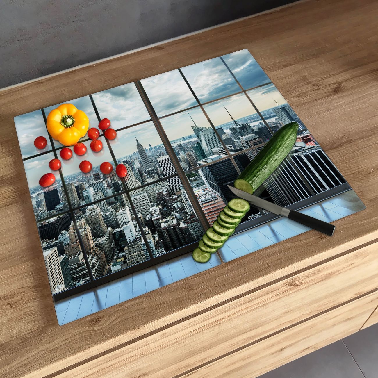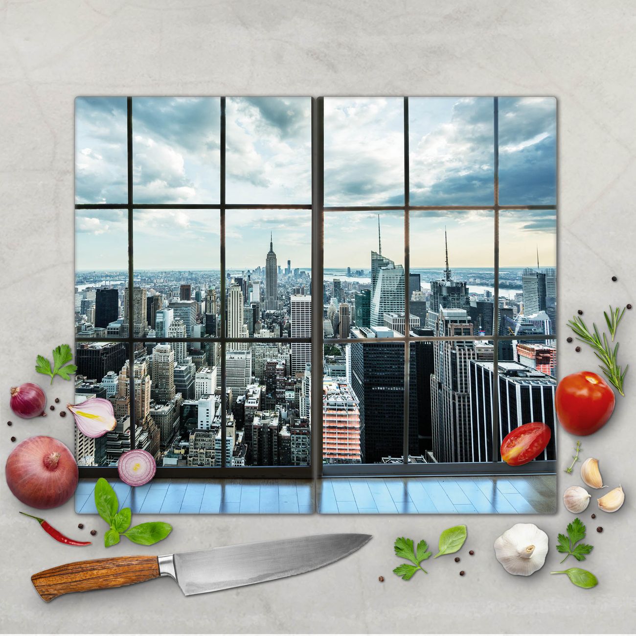 FUNKTION: Das banjado Schneidebrett mit Motiv Skyline Manhattan ist groß und rutschfest und damit ideal für Ihre Küche. Besonders praktisch. Das Schneidebrett ist vielseitig einsetzbar: ob als Spritzschutz hinter dem Herd für Ihre Küche oder als Glas Schneidebrett als hygienische und geruchsneutrale Unterlage. Sie können ebenfalls heiße Töpfe und Pfannen bis 100°C auf der Herdplattenabdeckung abstellen. Sie erhalten ein Multitalent für Ihre Küche. QUALITÄT: Die Schneideplatte Glas besteht aus hochwertigem, gehärtetem und hitzebeständigem Glas. Wählen Sie aus einem unserer zahlreichen Motive das passende Design für Ihre Küche aus. DETAILS: Das Schneidebrett Glas groß ist in verschiedenen Größen verfügbar. Sie erhalten separate Gumminoppen damit Ihr großes Schneidebrett rutschfest in der Küche steht. VIELSEITIG: Das Schneidebrett modern ist ein Allrounder - als Schneideunterlage Küche direkt auf dem Herd oder separat und als Spritzschutz an der Wand aufgestellt - ein praktisches Küchenutensil. BANJADO: Auf Wunsch fertigen wir das Glas Schneide Brett auch als Sondergröße an. Mehrteilige Platten sind auch möglich. Kontaktieren Sie uns gern für eine Spezialanfertigung Ihrer Glasplatte Küche.