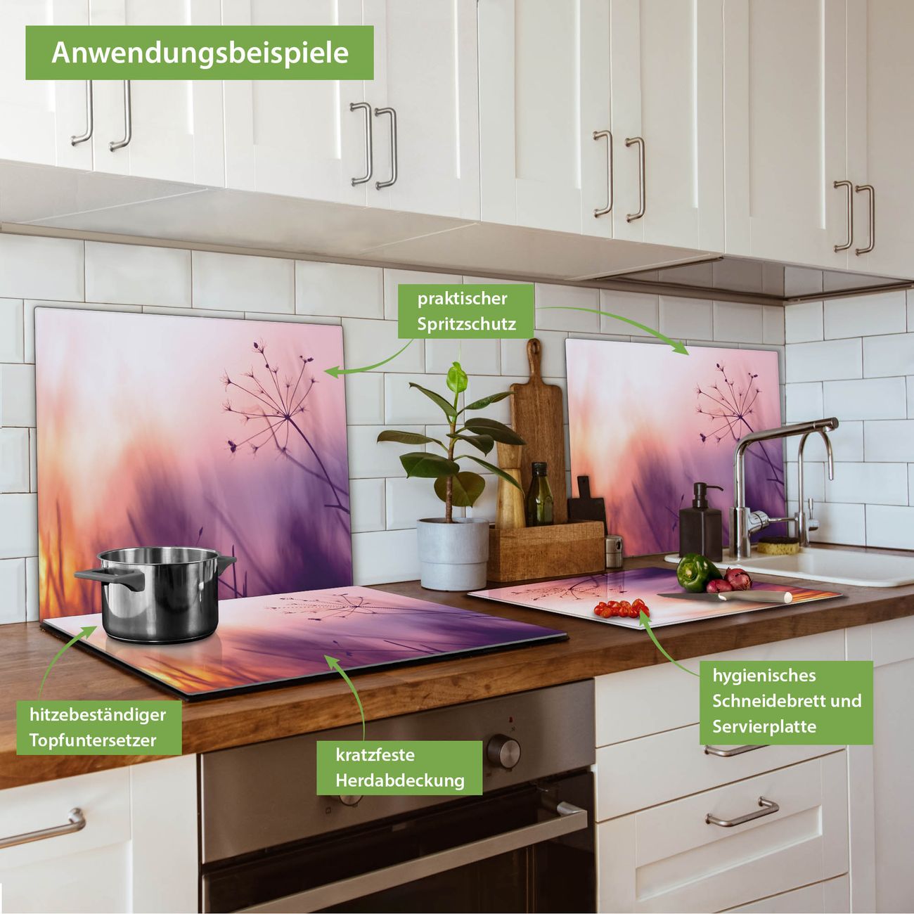 FUNKTION: Das banjado Schneidebrett mit Motiv Sommergras ist groß und rutschfest und damit ideal für Ihre Küche. Besonders praktisch. Das Schneidebrett ist vielseitig einsetzbar: ob als Spritzschutz hinter dem Herd für Ihre Küche oder als Glas Schneidebrett als hygienische und geruchsneutrale Unterlage. Sie können ebenfalls heiße Töpfe und Pfannen bis 100°C auf der Herdplattenabdeckung abstellen. Sie erhalten ein Multitalent für Ihre Küche. QUALITÄT: Die Schneideplatte Glas besteht aus hochwertigem, gehärtetem und hitzebeständigem Glas. Wählen Sie aus einem unserer zahlreichen Motive das passende Design für Ihre Küche aus. DETAILS: Das Schneidebrett Glas groß ist in verschiedenen Größen verfügbar. Sie erhalten separate Gumminoppen damit Ihr großes Schneidebrett rutschfest in der Küche steht. VIELSEITIG: Das Schneidebrett modern ist ein Allrounder - als Schneideunterlage Küche direkt auf dem Herd oder separat und als Spritzschutz an der Wand aufgestellt - ein praktisches Küchenutensil. BANJADO: Auf Wunsch fertigen wir das Glas Schneide Brett auch als Sondergröße an. Mehrteilige Platten sind auch möglich. Kontaktieren Sie uns gern für eine Spezialanfertigung Ihrer Glasplatte Küche.