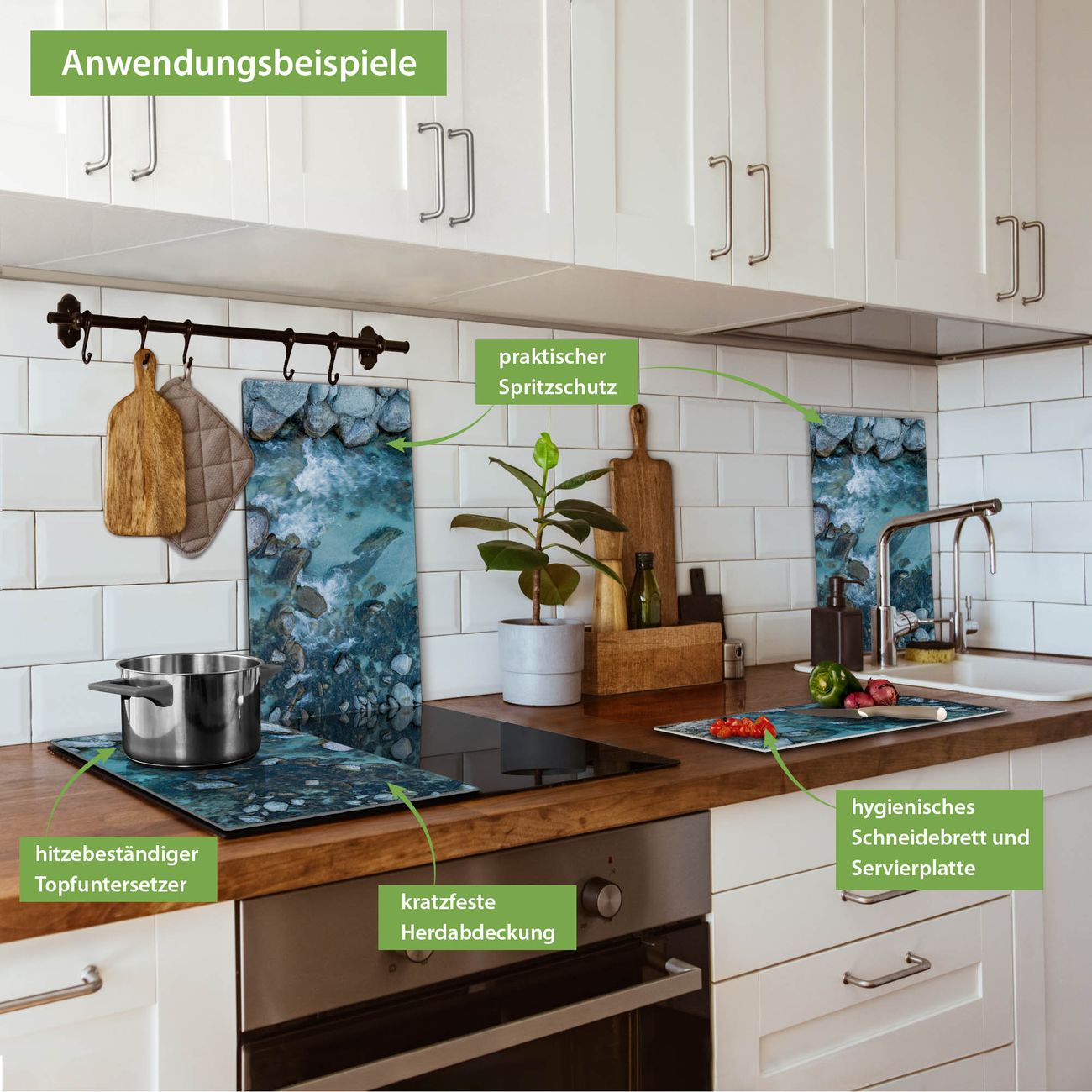 FUNKTION: Das banjado Schneidebrett mit Motiv Steinbucht 2 ist groß und rutschfest und damit ideal für Ihre Küche. Besonders praktisch. Das Schneidebrett ist vielseitig einsetzbar: ob als Spritzschutz hinter dem Herd für Ihre Küche oder als Glas Schneidebrett als hygienische und geruchsneutrale Unterlage. Sie können ebenfalls heiße Töpfe und Pfannen bis 100°C auf der Herdplattenabdeckung abstellen. Sie erhalten ein Multitalent für Ihre Küche. QUALITÄT: Die Schneideplatte Glas besteht aus hochwertigem, gehärtetem und hitzebeständigem Glas. Wählen Sie aus einem unserer zahlreichen Motive das passende Design für Ihre Küche aus. DETAILS: Das Schneidebrett Glas groß ist in verschiedenen Größen verfügbar. Sie erhalten separate Gumminoppen damit Ihr großes Schneidebrett rutschfest in der Küche steht. VIELSEITIG: Das Schneidebrett modern ist ein Allrounder - als Schneideunterlage Küche direkt auf dem Herd oder separat und als Spritzschutz an der Wand aufgestellt - ein praktisches Küchenutensil. BANJADO: Auf Wunsch fertigen wir das Glas Schneide Brett auch als Sondergröße an. Mehrteilige Platten sind auch möglich. Kontaktieren Sie uns gern für eine Spezialanfertigung Ihrer Glasplatte Küche.