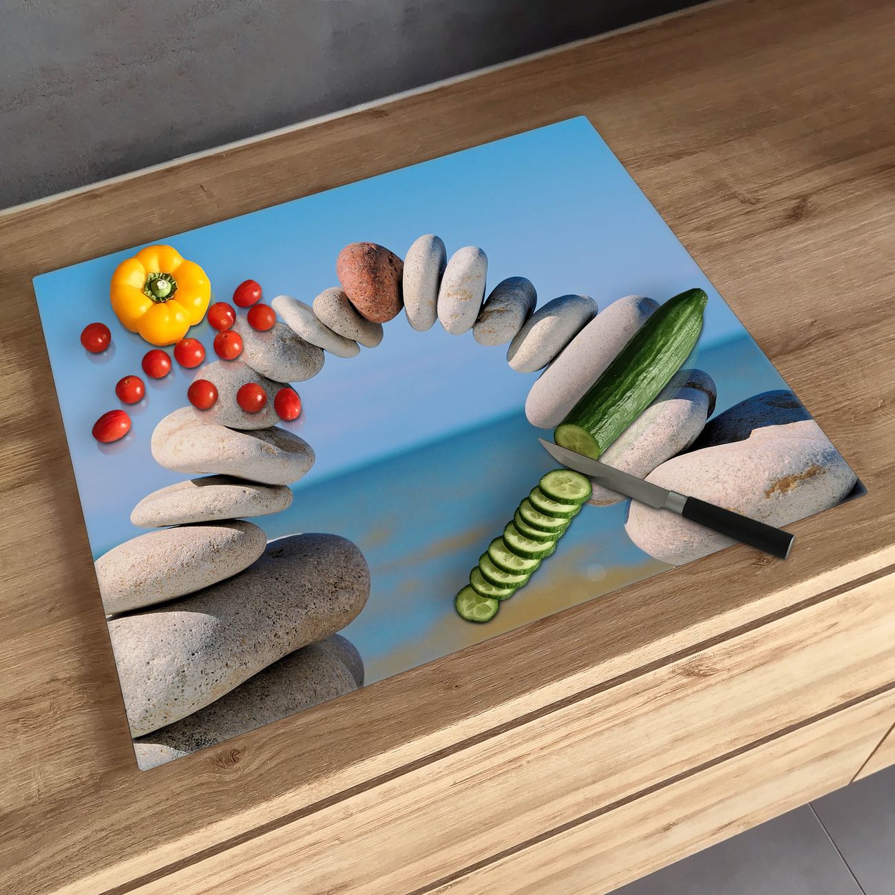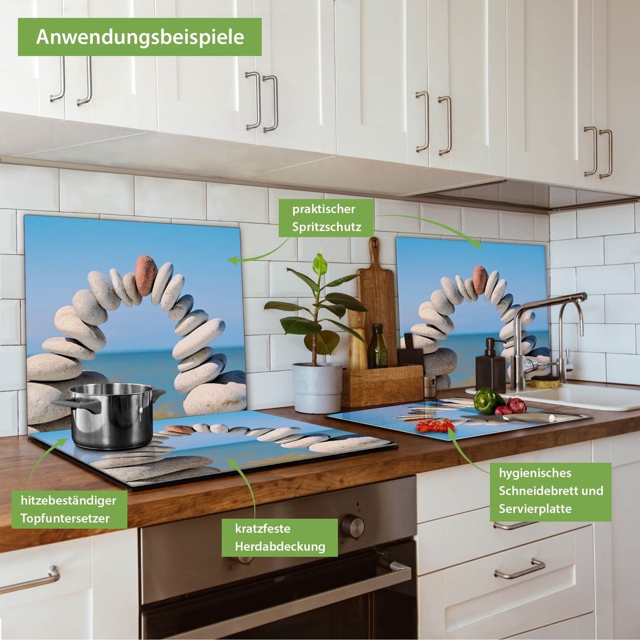 FUNKTION: Das banjado Schneidebrett mit Motiv Steine&Meer ist groß und rutschfest und damit ideal für Ihre Küche. Besonders praktisch. Das Schneidebrett ist vielseitig einsetzbar: ob als Spritzschutz hinter dem Herd für Ihre Küche oder als Glas Schneidebrett als hygienische und geruchsneutrale Unterlage. Sie können ebenfalls heiße Töpfe und Pfannen bis 100°C auf der Herdplattenabdeckung abstellen. Sie erhalten ein Multitalent für Ihre Küche. QUALITÄT: Die Schneideplatte Glas besteht aus hochwertigem, gehärtetem und hitzebeständigem Glas. Wählen Sie aus einem unserer zahlreichen Motive das passende Design für Ihre Küche aus. DETAILS: Das Schneidebrett Glas groß ist in verschiedenen Größen verfügbar. Sie erhalten separate Gumminoppen damit Ihr großes Schneidebrett rutschfest in der Küche steht. VIELSEITIG: Das Schneidebrett modern ist ein Allrounder - als Schneideunterlage Küche direkt auf dem Herd oder separat und als Spritzschutz an der Wand aufgestellt - ein praktisches Küchenutensil. BANJADO: Auf Wunsch fertigen wir das Glas Schneide Brett auch als Sondergröße an. Mehrteilige Platten sind auch möglich. Kontaktieren Sie uns gern für eine Spezialanfertigung Ihrer Glasplatte Küche.