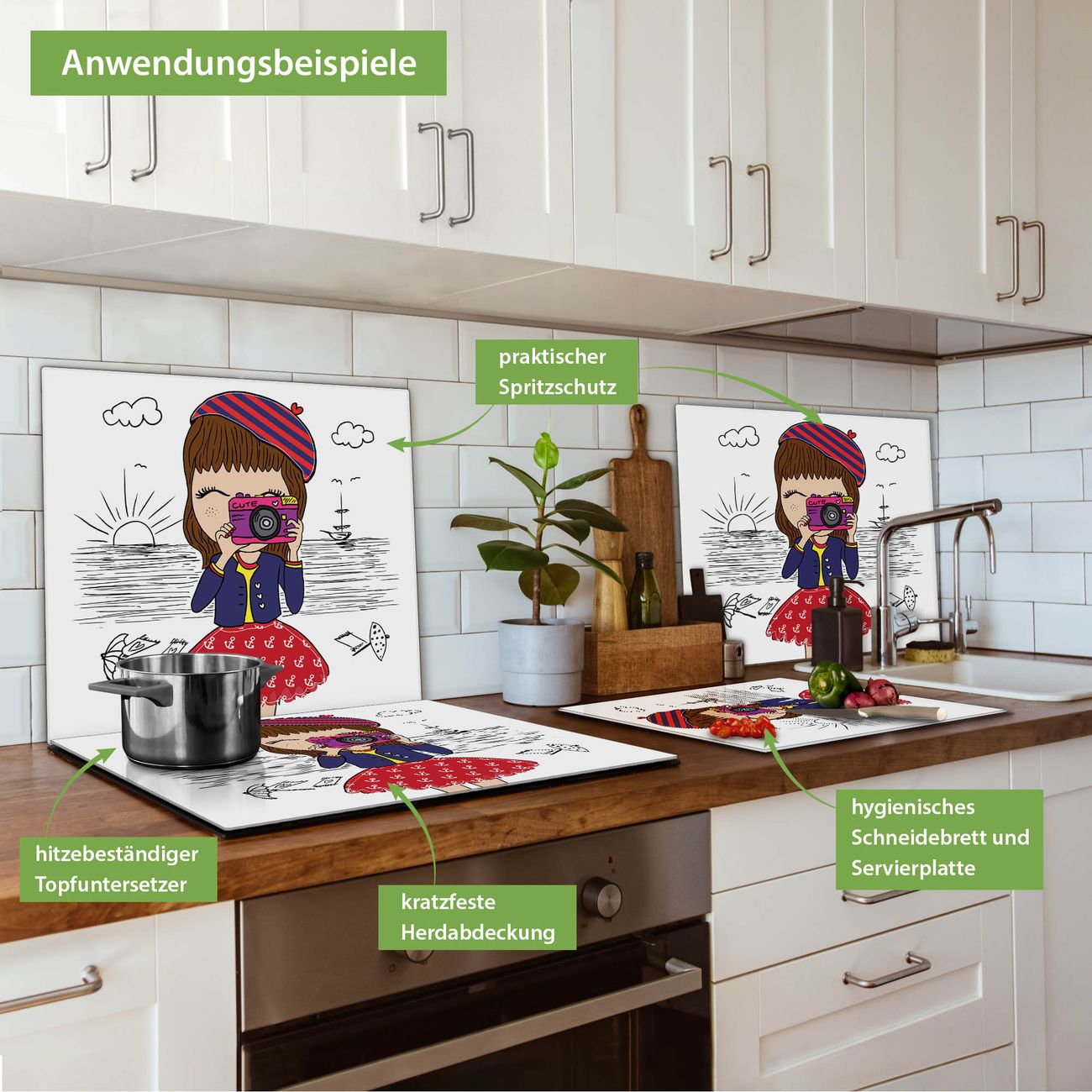 FUNKTION: Das banjado Schneidebrett mit Motiv Süße Kamera ist groß und rutschfest und damit ideal für Ihre Küche. Besonders praktisch. Das Schneidebrett ist vielseitig einsetzbar: ob als Spritzschutz hinter dem Herd für Ihre Küche oder als Glas Schneidebrett als hygienische und geruchsneutrale Unterlage. Sie können ebenfalls heiße Töpfe und Pfannen bis 100°C auf der Herdplattenabdeckung abstellen. Sie erhalten ein Multitalent für Ihre Küche. QUALITÄT: Die Schneideplatte Glas besteht aus hochwertigem, gehärtetem und hitzebeständigem Glas. Wählen Sie aus einem unserer zahlreichen Motive das passende Design für Ihre Küche aus. DETAILS: Das Schneidebrett Glas groß ist in verschiedenen Größen verfügbar. Sie erhalten separate Gumminoppen damit Ihr großes Schneidebrett rutschfest in der Küche steht. VIELSEITIG: Das Schneidebrett modern ist ein Allrounder - als Schneideunterlage Küche direkt auf dem Herd oder separat und als Spritzschutz an der Wand aufgestellt - ein praktisches Küchenutensil. BANJADO: Auf Wunsch fertigen wir das Glas Schneide Brett auch als Sondergröße an. Mehrteilige Platten sind auch möglich. Kontaktieren Sie uns gern für eine Spezialanfertigung Ihrer Glasplatte Küche.