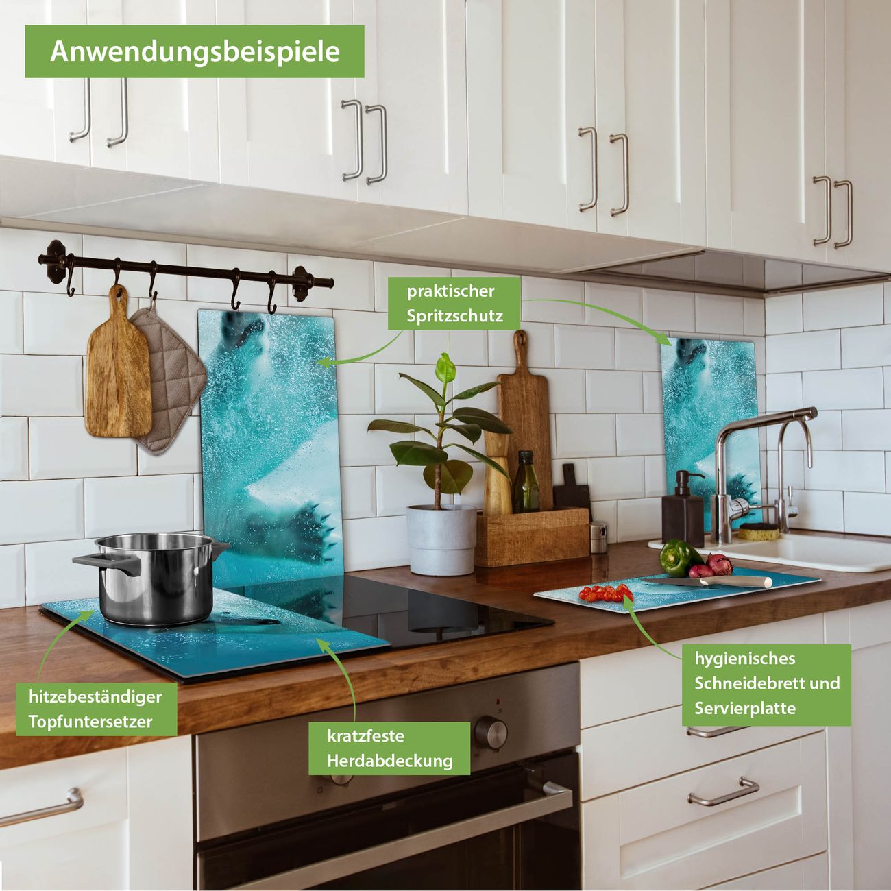 FUNKTION: Das banjado Schneidebrett mit Motiv Tauchender Eisbär ist groß und rutschfest und damit ideal für Ihre Küche. Besonders praktisch. Das Schneidebrett ist vielseitig einsetzbar: ob als Spritzschutz hinter dem Herd für Ihre Küche oder als Glas Schneidebrett als hygienische und geruchsneutrale Unterlage. Sie können ebenfalls heiße Töpfe und Pfannen bis 100°C auf der Herdplattenabdeckung abstellen. Sie erhalten ein Multitalent für Ihre Küche. QUALITÄT: Die Schneideplatte Glas besteht aus hochwertigem, gehärtetem und hitzebeständigem Glas. Wählen Sie aus einem unserer zahlreichen Motive das passende Design für Ihre Küche aus. DETAILS: Das Schneidebrett Glas groß ist in verschiedenen Größen verfügbar. Sie erhalten separate Gumminoppen damit Ihr großes Schneidebrett rutschfest in der Küche steht. VIELSEITIG: Das Schneidebrett modern ist ein Allrounder - als Schneideunterlage Küche direkt auf dem Herd oder separat und als Spritzschutz an der Wand aufgestellt - ein praktisches Küchenutensil. BANJADO: Auf Wunsch fertigen wir das Glas Schneide Brett auch als Sondergröße an. Mehrteilige Platten sind auch möglich. Kontaktieren Sie uns gern für eine Spezialanfertigung Ihrer Glasplatte Küche.