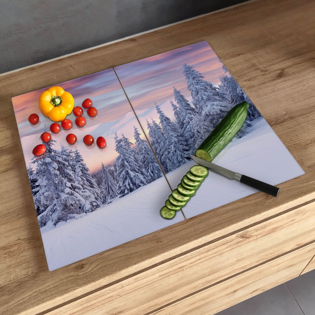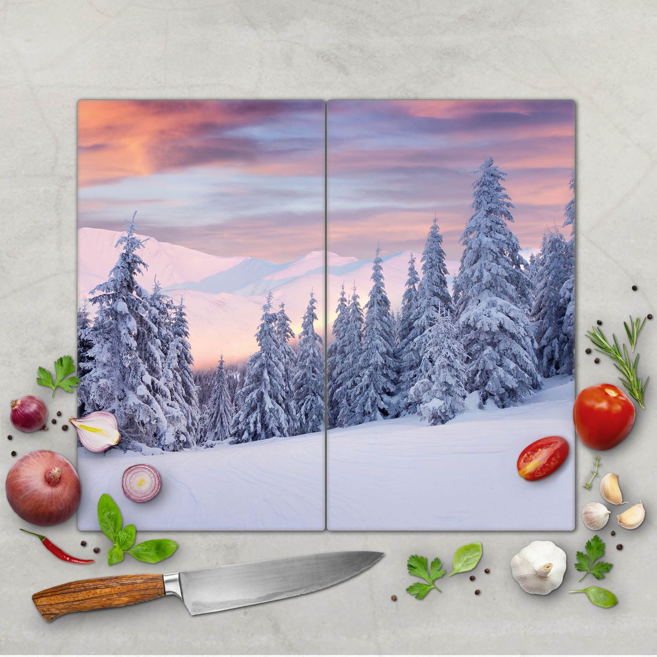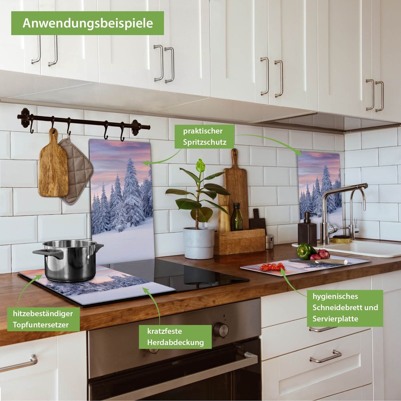 FUNKTION: Das banjado Schneidebrett mit Motiv Verschneite Berge ist groß und rutschfest und damit ideal für Ihre Küche. Besonders praktisch. Das Schneidebrett ist vielseitig einsetzbar: ob als Spritzschutz hinter dem Herd für Ihre Küche oder als Glas Schneidebrett als hygienische und geruchsneutrale Unterlage. Sie können ebenfalls heiße Töpfe und Pfannen bis 100°C auf der Herdplattenabdeckung abstellen. Sie erhalten ein Multitalent für Ihre Küche. QUALITÄT: Die Schneideplatte Glas besteht aus hochwertigem, gehärtetem und hitzebeständigem Glas. Wählen Sie aus einem unserer zahlreichen Motive das passende Design für Ihre Küche aus. DETAILS: Das Schneidebrett Glas groß ist in verschiedenen Größen verfügbar. Sie erhalten separate Gumminoppen damit Ihr großes Schneidebrett rutschfest in der Küche steht. VIELSEITIG: Das Schneidebrett modern ist ein Allrounder - als Schneideunterlage Küche direkt auf dem Herd oder separat und als Spritzschutz an der Wand aufgestellt - ein praktisches Küchenutensil. BANJADO: Auf Wunsch fertigen wir das Glas Schneide Brett auch als Sondergröße an. Mehrteilige Platten sind auch möglich. Kontaktieren Sie uns gern für eine Spezialanfertigung Ihrer Glasplatte Küche.