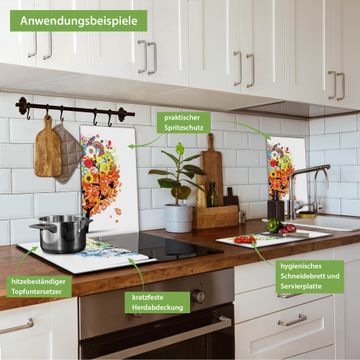 FUNKTION: Das banjado Schneidebrett mit Motiv Vier Jahreszeiten ist groß und rutschfest und damit ideal für Ihre Küche. Besonders praktisch. Das Schneidebrett ist vielseitig einsetzbar: ob als Spritzschutz hinter dem Herd für Ihre Küche oder als Glas Schneidebrett als hygienische und geruchsneutrale Unterlage. Sie können ebenfalls heiße Töpfe und Pfannen bis 100°C auf der Herdplattenabdeckung abstellen. Sie erhalten ein Multitalent für Ihre Küche. QUALITÄT: Die Schneideplatte Glas besteht aus hochwertigem, gehärtetem und hitzebeständigem Glas. Wählen Sie aus einem unserer zahlreichen Motive das passende Design für Ihre Küche aus. DETAILS: Das Schneidebrett Glas groß ist in verschiedenen Größen verfügbar. Sie erhalten separate Gumminoppen damit Ihr großes Schneidebrett rutschfest in der Küche steht. VIELSEITIG: Das Schneidebrett modern ist ein Allrounder - als Schneideunterlage Küche direkt auf dem Herd oder separat und als Spritzschutz an der Wand aufgestellt - ein praktisches Küchenutensil. BANJADO: Auf Wunsch fertigen wir das Glas Schneide Brett auch als Sondergröße an. Mehrteilige Platten sind auch möglich. Kontaktieren Sie uns gern für eine Spezialanfertigung Ihrer Glasplatte Küche.