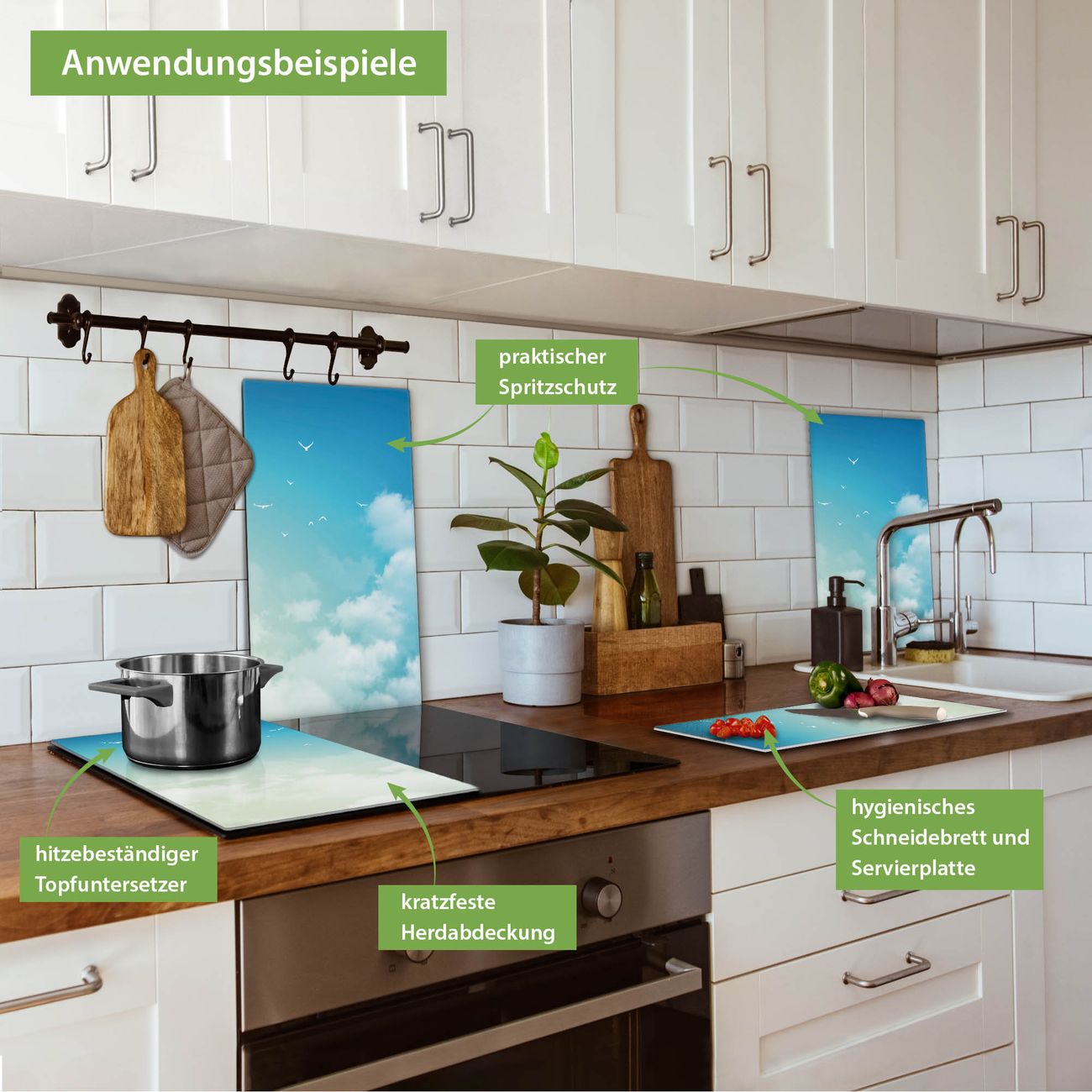 FUNKTION: Das banjado Schneidebrett mit Motiv Wolken 8 ist groß und rutschfest und damit ideal für Ihre Küche. Besonders praktisch. Das Schneidebrett ist vielseitig einsetzbar: ob als Spritzschutz hinter dem Herd für Ihre Küche oder als Glas Schneidebrett als hygienische und geruchsneutrale Unterlage. Sie können ebenfalls heiße Töpfe und Pfannen bis 100°C auf der Herdplattenabdeckung abstellen. Sie erhalten ein Multitalent für Ihre Küche. QUALITÄT: Die Schneideplatte Glas besteht aus hochwertigem, gehärtetem und hitzebeständigem Glas. Wählen Sie aus einem unserer zahlreichen Motive das passende Design für Ihre Küche aus. DETAILS: Das Schneidebrett Glas groß ist in verschiedenen Größen verfügbar. Sie erhalten separate Gumminoppen damit Ihr großes Schneidebrett rutschfest in der Küche steht. VIELSEITIG: Das Schneidebrett modern ist ein Allrounder - als Schneideunterlage Küche direkt auf dem Herd oder separat und als Spritzschutz an der Wand aufgestellt - ein praktisches Küchenutensil. BANJADO: Auf Wunsch fertigen wir das Glas Schneide Brett auch als Sondergröße an. Mehrteilige Platten sind auch möglich. Kontaktieren Sie uns gern für eine Spezialanfertigung Ihrer Glasplatte Küche.