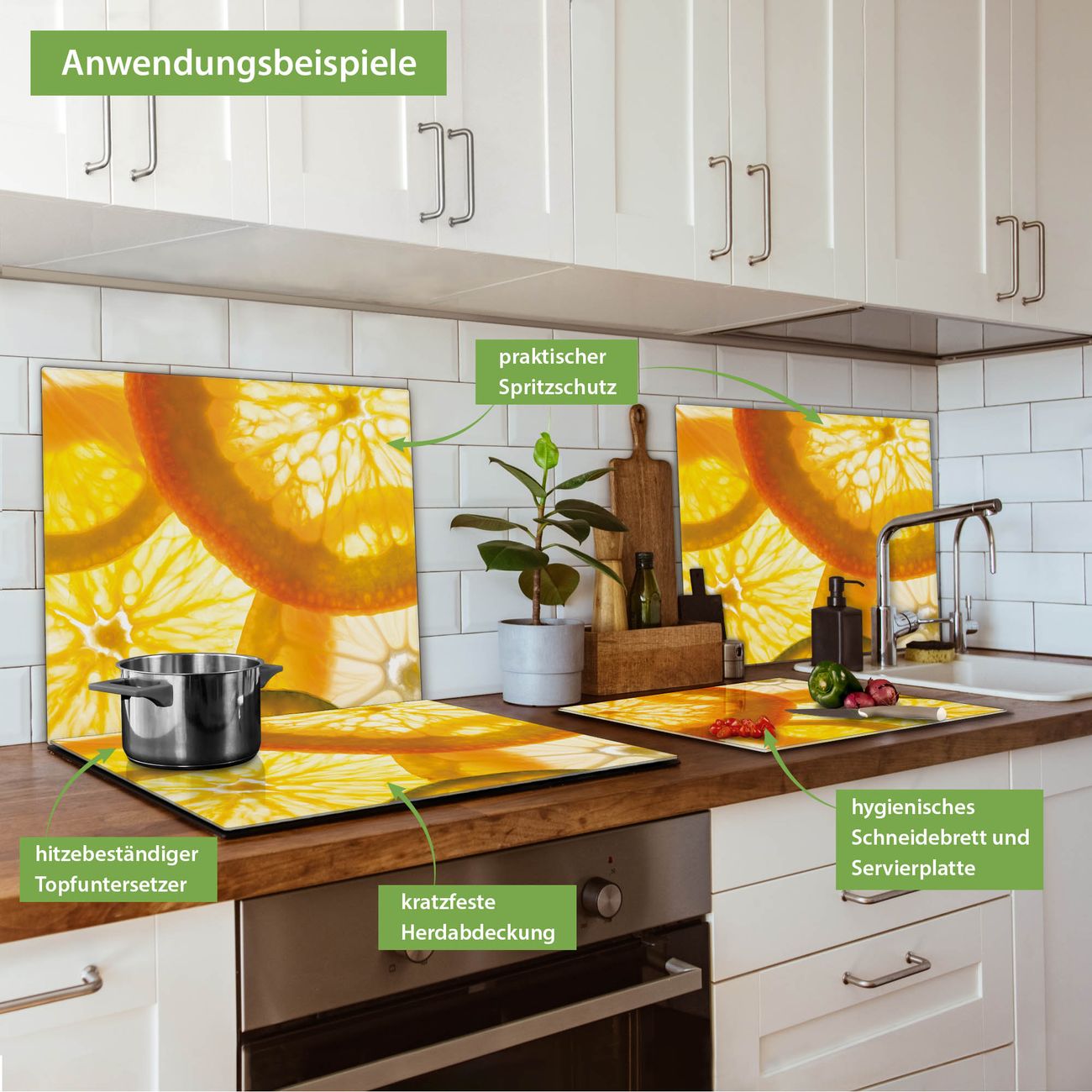 FUNKTION: Das banjado Schneidebrett mit Motiv Zitrusfrüchte ist groß und rutschfest und damit ideal für Ihre Küche. Besonders praktisch. Das Schneidebrett ist vielseitig einsetzbar: ob als Spritzschutz hinter dem Herd für Ihre Küche oder als Glas Schneidebrett als hygienische und geruchsneutrale Unterlage. Sie können ebenfalls heiße Töpfe und Pfannen bis 100°C auf der Herdplattenabdeckung abstellen. Sie erhalten ein Multitalent für Ihre Küche. QUALITÄT: Die Schneideplatte Glas besteht aus hochwertigem, gehärtetem und hitzebeständigem Glas. Wählen Sie aus einem unserer zahlreichen Motive das passende Design für Ihre Küche aus. DETAILS: Das Schneidebrett Glas groß ist in verschiedenen Größen verfügbar. Sie erhalten separate Gumminoppen damit Ihr großes Schneidebrett rutschfest in der Küche steht. VIELSEITIG: Das Schneidebrett modern ist ein Allrounder - als Schneideunterlage Küche direkt auf dem Herd oder separat und als Spritzschutz an der Wand aufgestellt - ein praktisches Küchenutensil. BANJADO: Auf Wunsch fertigen wir das Glas Schneide Brett auch als Sondergröße an. Mehrteilige Platten sind auch möglich. Kontaktieren Sie uns gern für eine Spezialanfertigung Ihrer Glasplatte Küche.