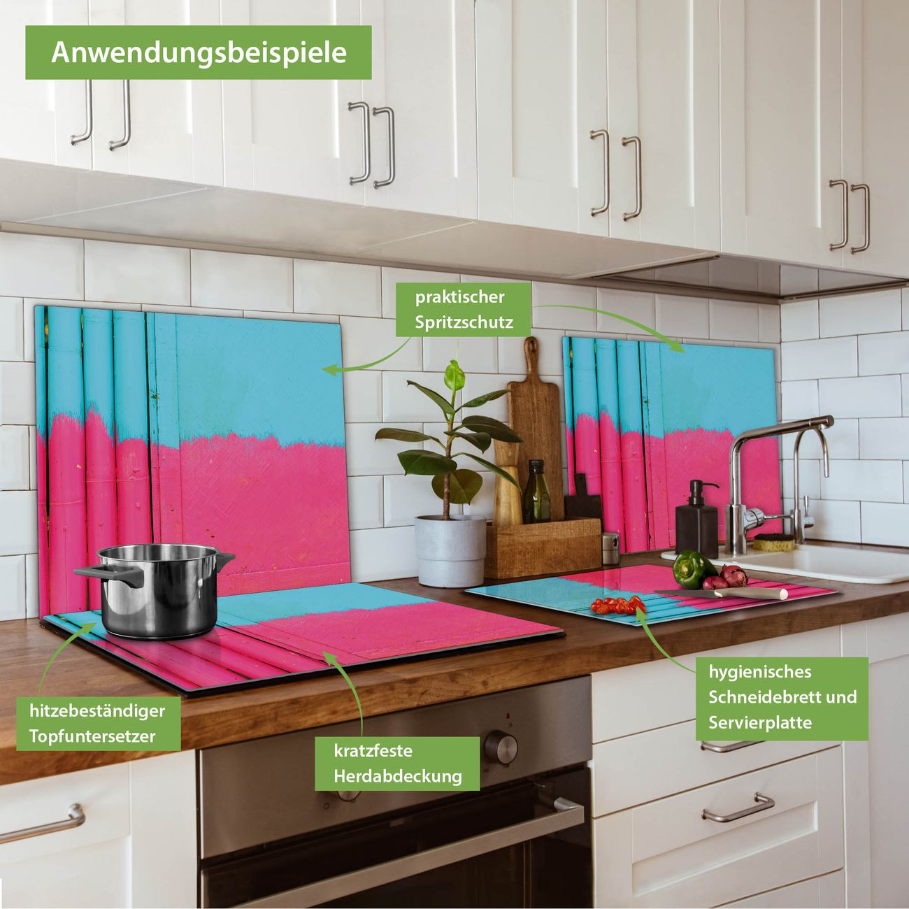 FUNKTION: Das banjado Schneidebrett mit Motiv Zwei Farben ist groß und rutschfest und damit ideal für Ihre Küche. Besonders praktisch. Das Schneidebrett ist vielseitig einsetzbar: ob als Spritzschutz hinter dem Herd für Ihre Küche oder als Glas Schneidebrett als hygienische und geruchsneutrale Unterlage. Sie können ebenfalls heiße Töpfe und Pfannen bis 100°C auf der Herdplattenabdeckung abstellen. Sie erhalten ein Multitalent für Ihre Küche. QUALITÄT: Die Schneideplatte Glas besteht aus hochwertigem, gehärtetem und hitzebeständigem Glas. Wählen Sie aus einem unserer zahlreichen Motive das passende Design für Ihre Küche aus. DETAILS: Das Schneidebrett Glas groß ist in verschiedenen Größen verfügbar. Sie erhalten separate Gumminoppen damit Ihr großes Schneidebrett rutschfest in der Küche steht. VIELSEITIG: Das Schneidebrett modern ist ein Allrounder - als Schneideunterlage Küche direkt auf dem Herd oder separat und als Spritzschutz an der Wand aufgestellt - ein praktisches Küchenutensil. BANJADO: Auf Wunsch fertigen wir das Glas Schneide Brett auch als Sondergröße an. Mehrteilige Platten sind auch möglich. Kontaktieren Sie uns gern für eine Spezialanfertigung Ihrer Glasplatte Küche.