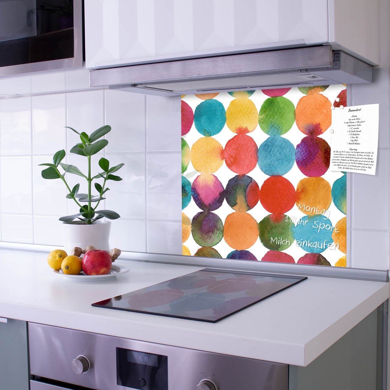 Die banjado Glas Küchenrückwand in verschiedenen Größen mit Motiv Aquarell Kreise schützt Ihre Küchenfliesen vor Fettspritzern oder Wasserflecken. Der Spritzschutz ist gleichzeitig magnetisch und hält Ihre Rezepte oder Einkaufslisten. 4 Neodym-Magnete und 1 Kreidestift liegen bereits bei. Leuchtende Motive und hochwertiges Material machen den Spritzschutz zum Designobjekt. Das dekorative Glasbild gibt Ihrer Küche ein individuelles Erscheinungsbild. Abgerundete Kanten und Sicherheitsglas sorgen für einen sicheren Einsatz.
