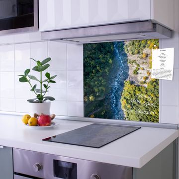 Die Küchenrückwand ist eine elegante Mehrzwecktafel: als Spritzschutz hinter Herd oder Waschbecken, hält Notizen wie ein Memoboard, ist beschreibbar mit Kreidestiften oder Whiteboard-Markern, sieht umwerfend als Glasbild aus. Sie besteht aus gehärtetem Glas, die Rückwand aus einem magnetischen Stahlblech. Durch die superflache Bauweise haben Sie die Wahl aus einer Vielzahl von Befestigungsmöglichkeiten. Sie können die Küchenrückwand mit einem Montagekleber superflach an die Wand kleben oder Sie wählen eines unserer passenden Befestigungssets, welches eine optimale Montage garantiert. Die Küchenrückwand besteht aus zertifiziertem Sicherheitsglas. Durch die mitgelieferten 4 Neodym-Magnete ist Ihre Glas Magnettafel sofort einsatzbereit.