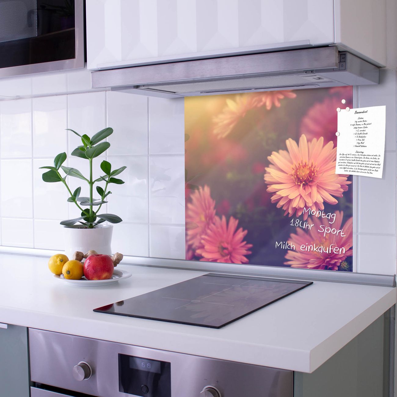 Die Küchenrückwand ist eine elegante Mehrzwecktafel: als Spritzschutz hinter Herd oder Waschbecken, hält Notizen wie ein Memoboard, ist beschreibbar mit Kreidestiften oder Whiteboard-Markern, sieht umwerfend als Glasbild aus. Sie besteht aus gehärtetem Glas, die Rückwand aus einem magnetischen Stahlblech. Durch die superflache Bauweise haben Sie die Wahl aus einer Vielzahl von Befestigungsmöglichkeiten. Sie können die Küchenrückwand mit einem Montagekleber superflach an die Wand kleben oder Sie wählen eines unserer passenden Befestigungssets, welches eine optimale Montage garantiert. Die Küchenrückwand besteht aus zertifiziertem Sicherheitsglas. Durch die mitgelieferten 4 Neodym-Magnete ist Ihre Glas Magnettafel sofort einsatzbereit.