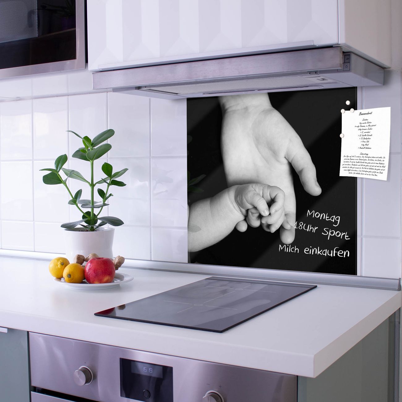 Die Küchenrückwand ist eine elegante Mehrzwecktafel: als Spritzschutz hinter Herd oder Waschbecken, hält Notizen wie ein Memoboard, ist beschreibbar mit Kreidestiften oder Whiteboard-Markern, sieht umwerfend als Glasbild aus. Sie besteht aus gehärtetem Glas, die Rückwand aus einem magnetischen Stahlblech. Durch die superflache Bauweise haben Sie die Wahl aus einer Vielzahl von Befestigungsmöglichkeiten. Sie können die Küchenrückwand mit einem Montagekleber superflach an die Wand kleben oder Sie wählen eines unserer passenden Befestigungssets, welches eine optimale Montage garantiert. Die Küchenrückwand besteht aus zertifiziertem Sicherheitsglas. Durch die mitgelieferten 4 Neodym-Magnete ist Ihre Glas Magnettafel sofort einsatzbereit.