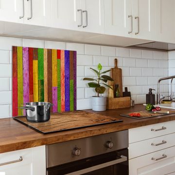 Die banjado Glas Küchenrückwand in verschiedenen Größen mit Motiv Holz Collage Bunt schützt Ihre Küchenfliesen vor Fettspritzern oder Wasserflecken. Der Spritzschutz ist gleichzeitig magnetisch und hält Ihre Rezepte oder Einkaufslisten. 4 Neodym-Magnete und 1 Kreidestift liegen bereits bei. Leuchtende Motive und hochwertiges Material machen den Spritzschutz zum Designobjekt. Das dekorative Glasbild gibt Ihrer Küche ein individuelles Erscheinungsbild. Abgerundete Kanten und Sicherheitsglas sorgen für einen sicheren Einsatz.