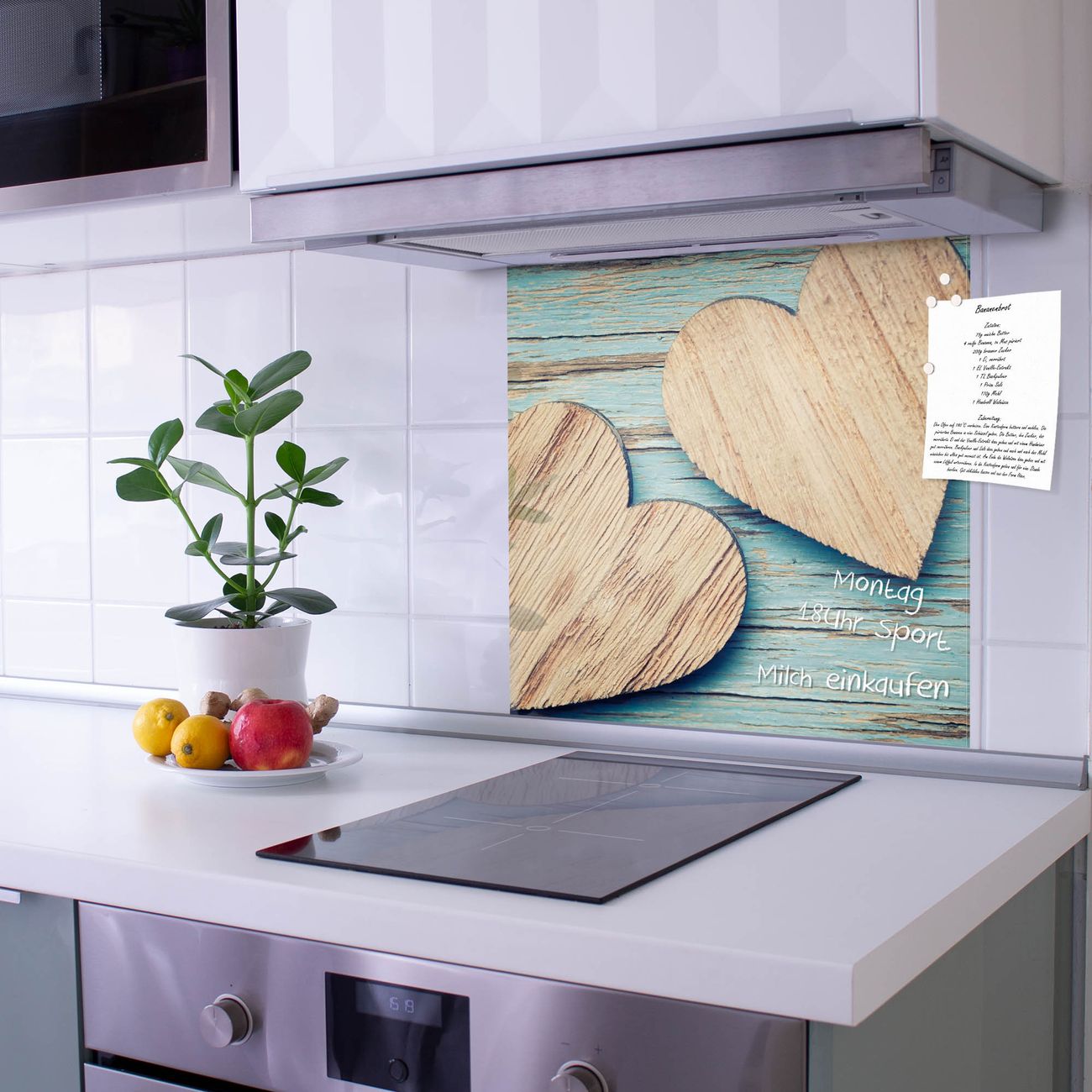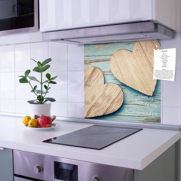 Die banjado Glas Küchenrückwand in verschiedenen Größen mit Motiv Holz Herzen schützt Ihre Küchenfliesen vor Fettspritzern oder Wasserflecken. Der Spritzschutz ist gleichzeitig magnetisch und hält Ihre Rezepte oder Einkaufslisten. 4 Neodym-Magnete und 1 Kreidestift liegen bereits bei. Leuchtende Motive und hochwertiges Material machen den Spritzschutz zum Designobjekt. Das dekorative Glasbild gibt Ihrer Küche ein individuelles Erscheinungsbild. Abgerundete Kanten und Sicherheitsglas sorgen für einen sicheren Einsatz.