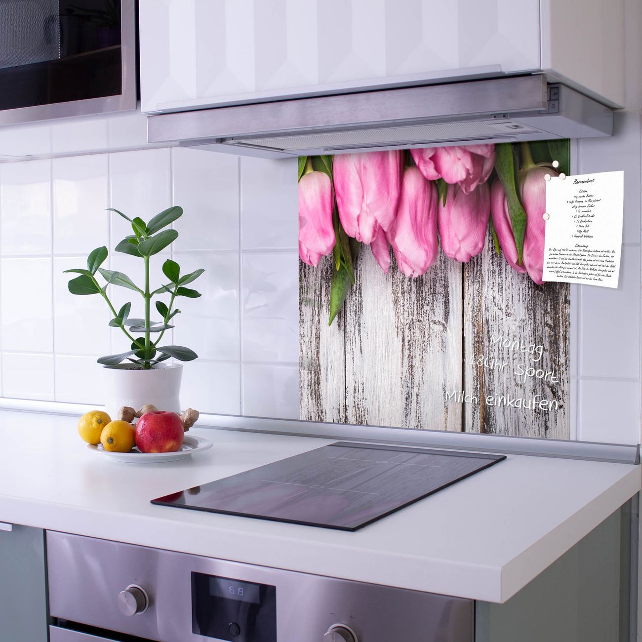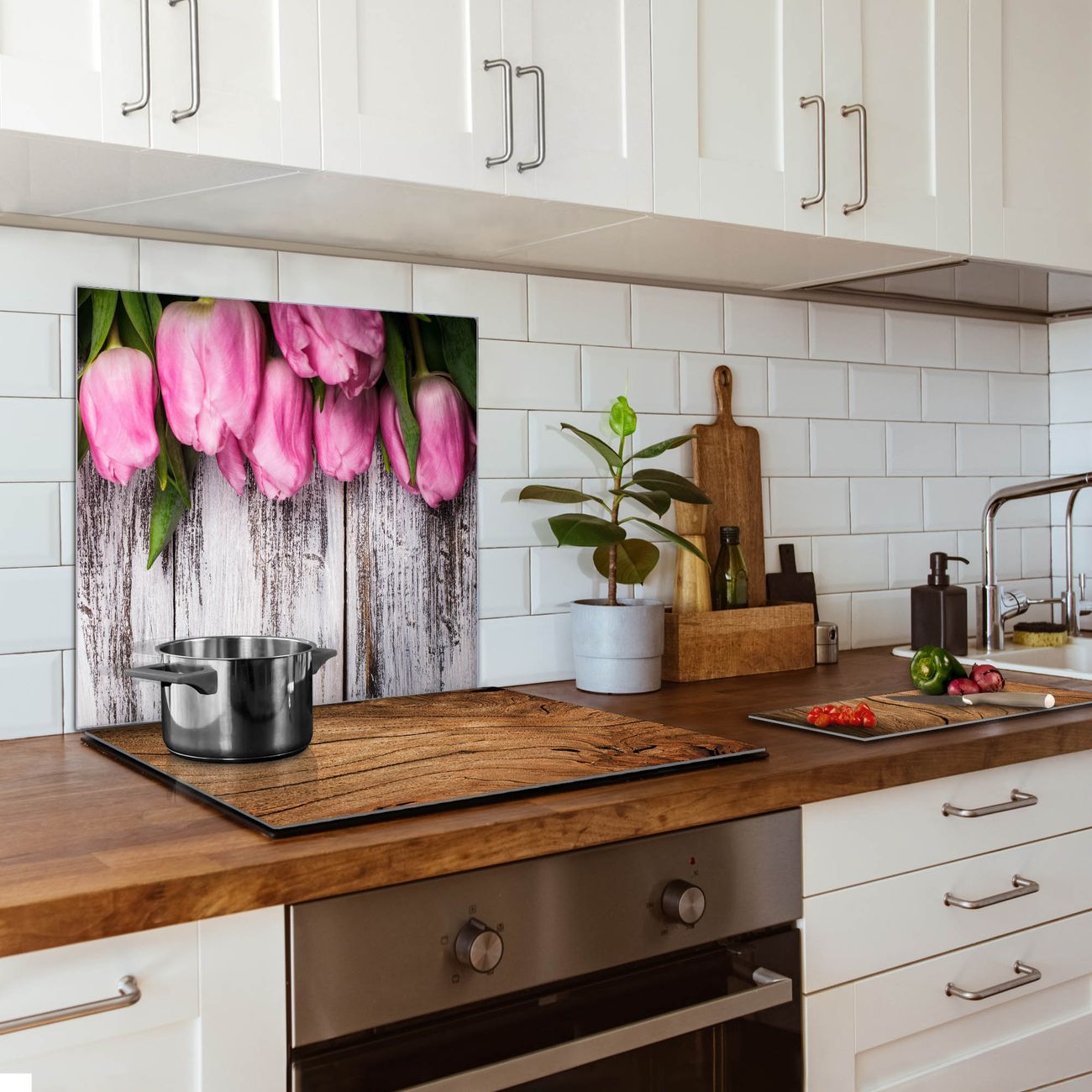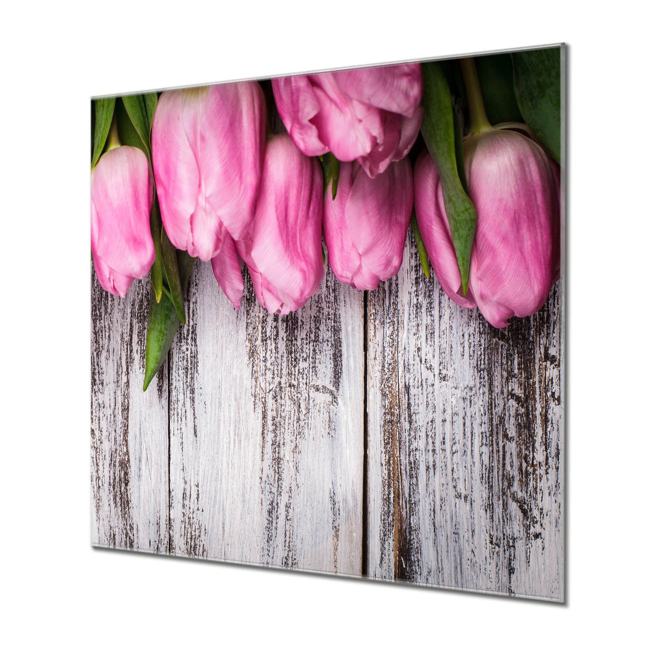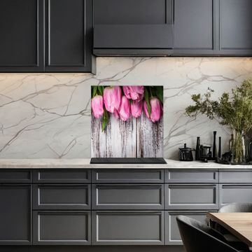 Küchenrückwand Glas Motiv Holz und Tulpen