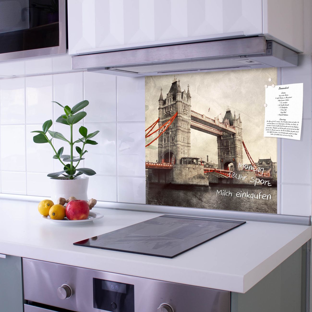 Die Küchenrückwand ist eine elegante Mehrzwecktafel: als Spritzschutz hinter Herd oder Waschbecken, hält Notizen wie ein Memoboard, ist beschreibbar mit Kreidestiften oder Whiteboard-Markern, sieht umwerfend als Glasbild aus. Sie besteht aus gehärtetem Glas, die Rückwand aus einem magnetischen Stahlblech. Durch die superflache Bauweise haben Sie die Wahl aus einer Vielzahl von Befestigungsmöglichkeiten. Sie können die Küchenrückwand mit einem Montagekleber superflach an die Wand kleben oder Sie wählen eines unserer passenden Befestigungssets, welches eine optimale Montage garantiert. Die Küchenrückwand besteht aus zertifiziertem Sicherheitsglas. Durch die mitgelieferten 4 Neodym-Magnete ist Ihre Glas Magnettafel sofort einsatzbereit.