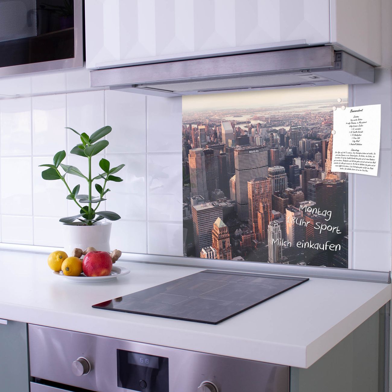 Die Küchenrückwand ist eine elegante Mehrzwecktafel: als Spritzschutz hinter Herd oder Waschbecken, hält Notizen wie ein Memoboard, ist beschreibbar mit Kreidestiften oder Whiteboard-Markern, sieht umwerfend als Glasbild aus. Sie besteht aus gehärtetem Glas, die Rückwand aus einem magnetischen Stahlblech. Durch die superflache Bauweise haben Sie die Wahl aus einer Vielzahl von Befestigungsmöglichkeiten. Sie können die Küchenrückwand mit einem Montagekleber superflach an die Wand kleben oder Sie wählen eines unserer passenden Befestigungssets, welches eine optimale Montage garantiert. Die Küchenrückwand besteht aus zertifiziertem Sicherheitsglas. Durch die mitgelieferten 4 Neodym-Magnete ist Ihre Glas Magnettafel sofort einsatzbereit.