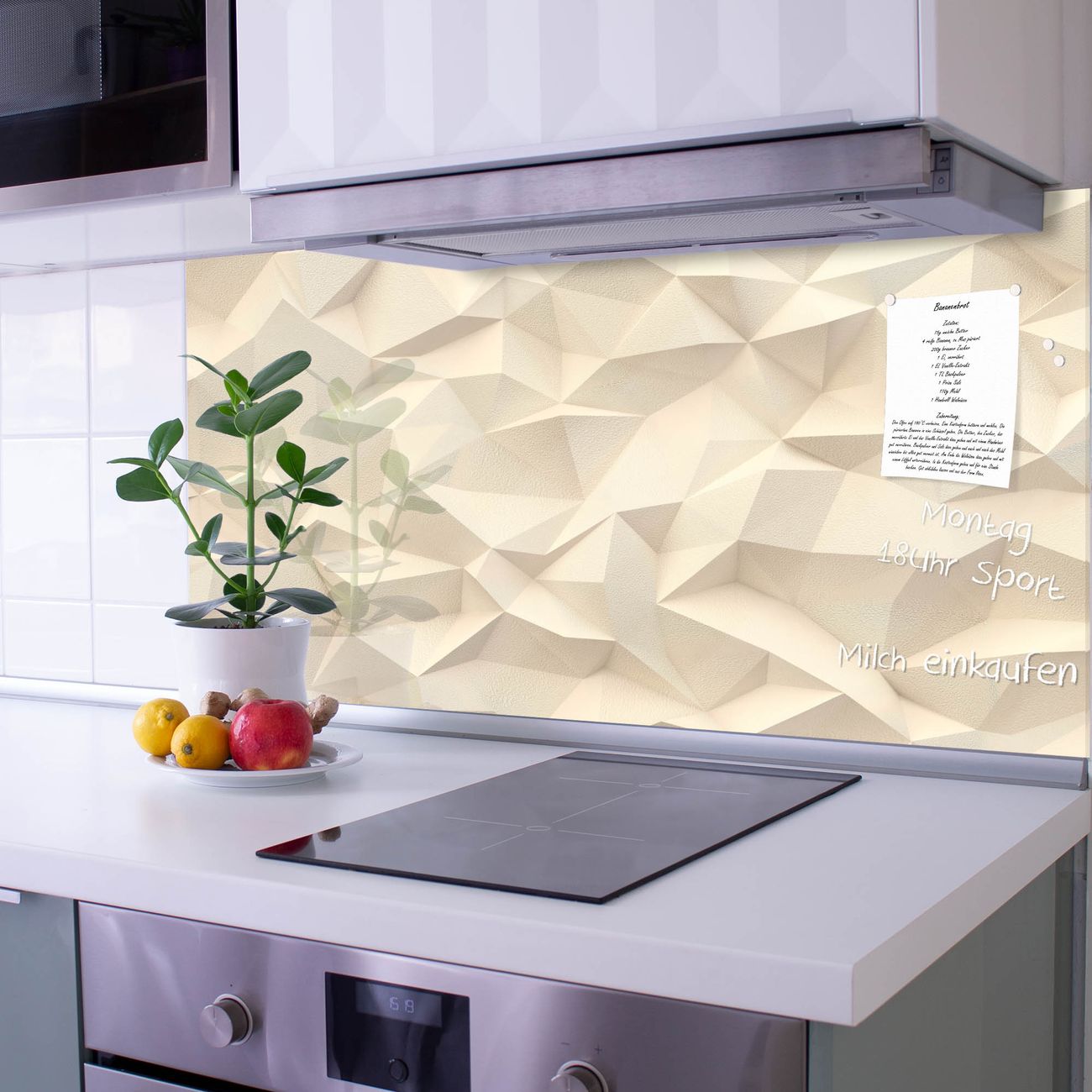 Die Küchenrückwand ist eine elegante Mehrzwecktafel: als Spritzschutz hinter Herd oder Waschbecken, hält Notizen wie ein Memoboard, ist beschreibbar mit Kreidestiften oder Whiteboard-Markern, sieht umwerfend als Glasbild aus. Sie besteht aus gehärtetem Glas, die Rückwand aus einem magnetischen Stahlblech. Durch die superflache Bauweise haben Sie die Wahl aus einer Vielzahl von Befestigungsmöglichkeiten. Sie können die Küchenrückwand mit einem Montagekleber superflach an die Wand kleben oder Sie wählen eines unserer passenden Befestigungssets, welches eine optimale Montage garantiert. Die Küchenrückwand besteht aus zertifiziertem Sicherheitsglas. Durch die mitgelieferten 4 Neodym-Magnete ist Ihre Glas Magnettafel sofort einsatzbereit.