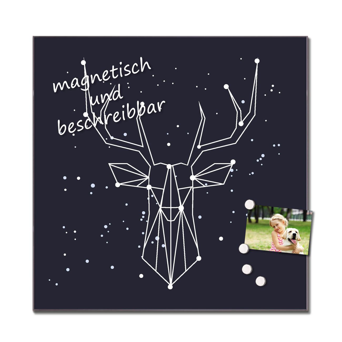 Die banjado Glas Küchenrückwand in verschiedenen Größen mit Motiv Sternbild Hirsch schützt Ihre Küchenfliesen vor Fettspritzern oder Wasserflecken. Der Spritzschutz ist gleichzeitig magnetisch und hält Ihre Rezepte oder Einkaufslisten. 4 Neodym-Magnete und 1 Kreidestift liegen bereits bei. Leuchtende Motive und hochwertiges Material machen den Spritzschutz zum Designobjekt. Das dekorative Glasbild gibt Ihrer Küche ein individuelles Erscheinungsbild. Abgerundete Kanten und Sicherheitsglas sorgen für einen sicheren Einsatz.