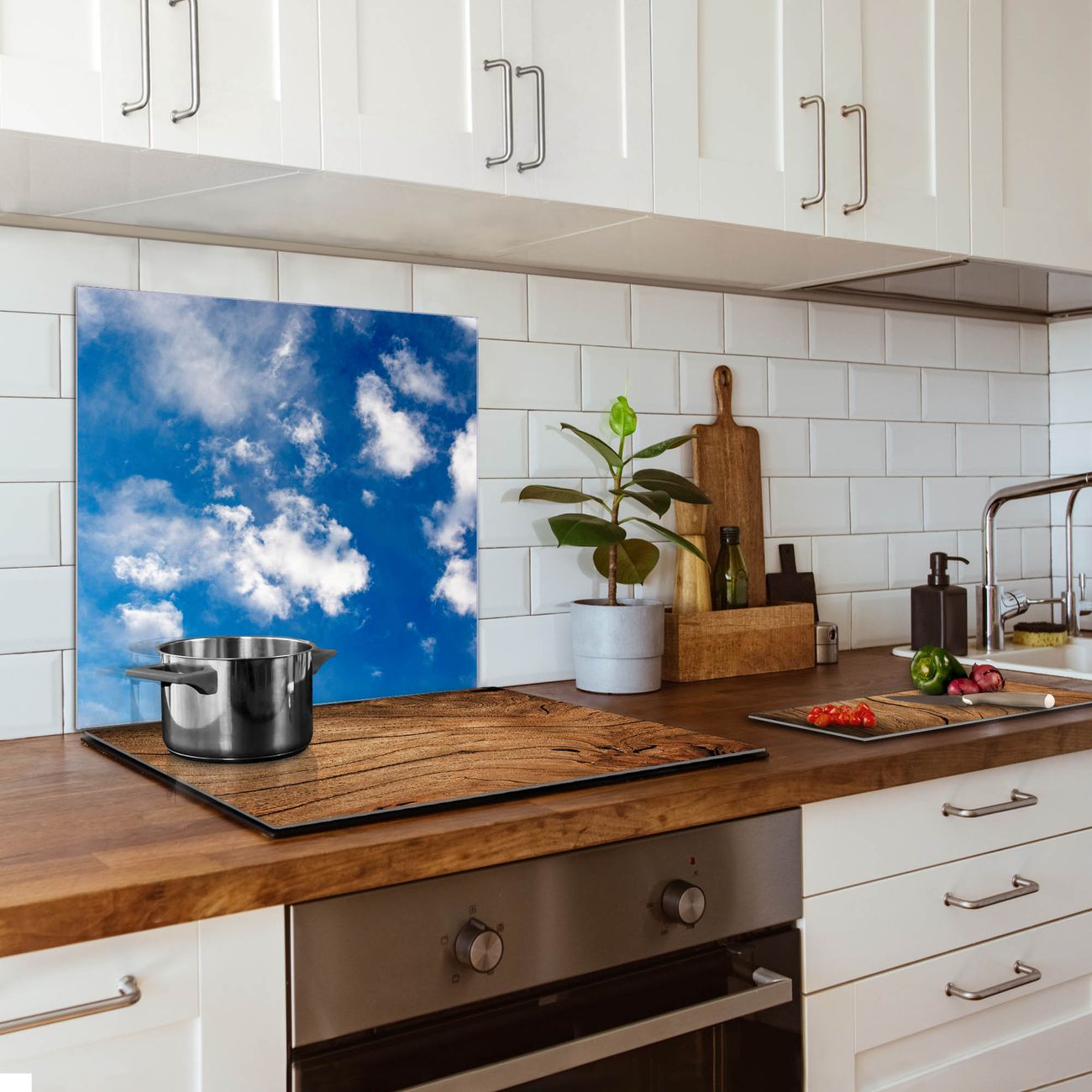Die banjado Glas Küchenrückwand in verschiedenen Größen mit Motiv Wolken 2 schützt Ihre Küchenfliesen vor Fettspritzern oder Wasserflecken. Der Spritzschutz ist gleichzeitig magnetisch und hält Ihre Rezepte oder Einkaufslisten. 4 Neodym-Magnete und 1 Kreidestift liegen bereits bei. Leuchtende Motive und hochwertiges Material machen den Spritzschutz zum Designobjekt. Das dekorative Glasbild gibt Ihrer Küche ein individuelles Erscheinungsbild. Abgerundete Kanten und Sicherheitsglas sorgen für einen sicheren Einsatz.