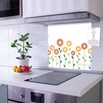 Die banjado Glas Küchenrückwand in verschiedenen Größen mit Motiv Abstrakte Margeriten schützt Ihre Küchenfliesen vor Fettspritzern oder Wasserflecken. Der Spritzschutz ist gleichzeitig magnetisch und hält Ihre Rezepte oder Einkaufslisten. 4 Neodym-Magnete und 1 Kreidestift liegen bereits bei. Leuchtende Motive und hochwertiges Material machen den Spritzschutz zum Designobjekt. Das dekorative Glasbild gibt Ihrer Küche ein individuelles Erscheinungsbild. Abgerundete Kanten und Sicherheitsglas sorgen für einen sicheren Einsatz.