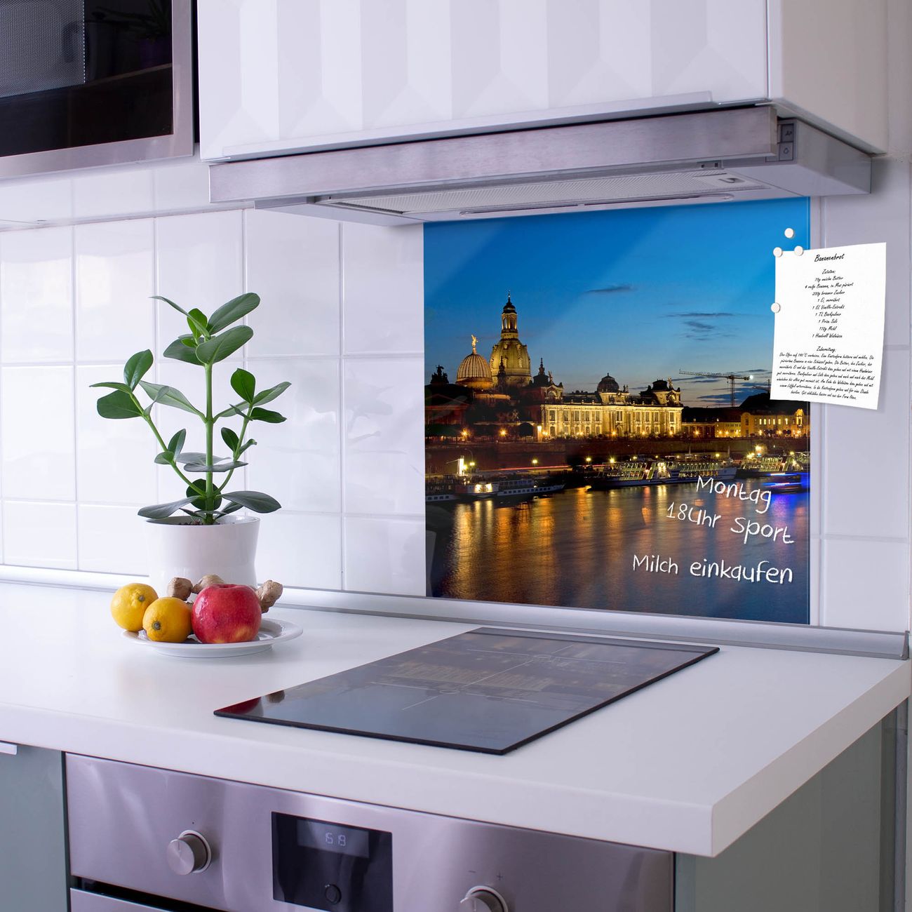 Die Küchenrückwand ist eine elegante Mehrzwecktafel: als Spritzschutz hinter Herd oder Waschbecken, hält Notizen wie ein Memoboard, ist beschreibbar mit Kreidestiften oder Whiteboard-Markern, sieht umwerfend als Glasbild aus. Sie besteht aus gehärtetem Glas, die Rückwand aus einem magnetischen Stahlblech. Durch die superflache Bauweise haben Sie die Wahl aus einer Vielzahl von Befestigungsmöglichkeiten. Sie können die Küchenrückwand mit einem Montagekleber superflach an die Wand kleben oder Sie wählen eines unserer passenden Befestigungssets, welches eine optimale Montage garantiert. Die Küchenrückwand besteht aus zertifiziertem Sicherheitsglas. Durch die mitgelieferten 4 Neodym-Magnete ist Ihre Glas Magnettafel sofort einsatzbereit.
