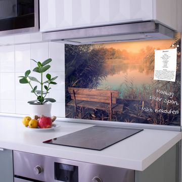 Die banjado Glas Küchenrückwand in verschiedenen Größen mit Motiv Bank Am See schützt Ihre Küchenfliesen vor Fettspritzern oder Wasserflecken. Der Spritzschutz ist gleichzeitig magnetisch und hält Ihre Rezepte oder Einkaufslisten. 4 Neodym-Magnete und 1 Kreidestift liegen bereits bei. Leuchtende Motive und hochwertiges Material machen den Spritzschutz zum Designobjekt. Das dekorative Glasbild gibt Ihrer Küche ein individuelles Erscheinungsbild. Abgerundete Kanten und Sicherheitsglas sorgen für einen sicheren Einsatz.