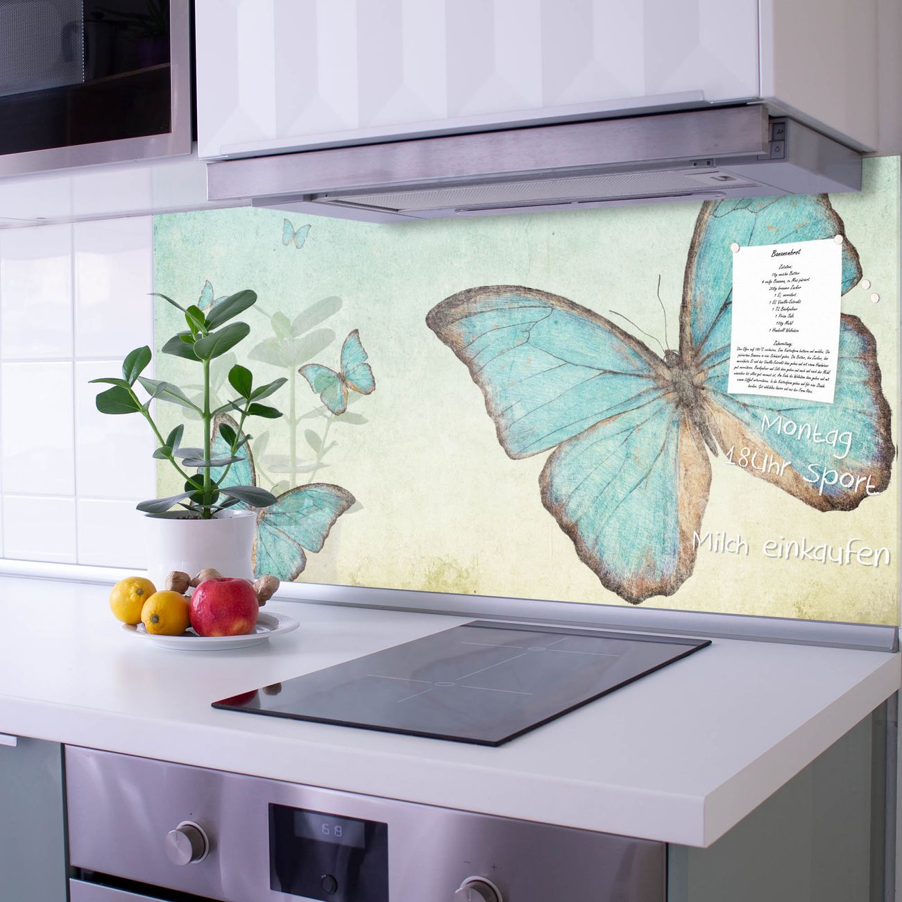 Die banjado Glas Küchenrückwand in verschiedenen Größen mit Motiv Blaue Schmetterlinge schützt Ihre Küchenfliesen vor Fettspritzern oder Wasserflecken. Der Spritzschutz ist gleichzeitig magnetisch und hält Ihre Rezepte oder Einkaufslisten. 4 Neodym-Magnete und 1 Kreidestift liegen bereits bei. Leuchtende Motive und hochwertiges Material machen den Spritzschutz zum Designobjekt. Das dekorative Glasbild gibt Ihrer Küche ein individuelles Erscheinungsbild. Abgerundete Kanten und Sicherheitsglas sorgen für einen sicheren Einsatz.
