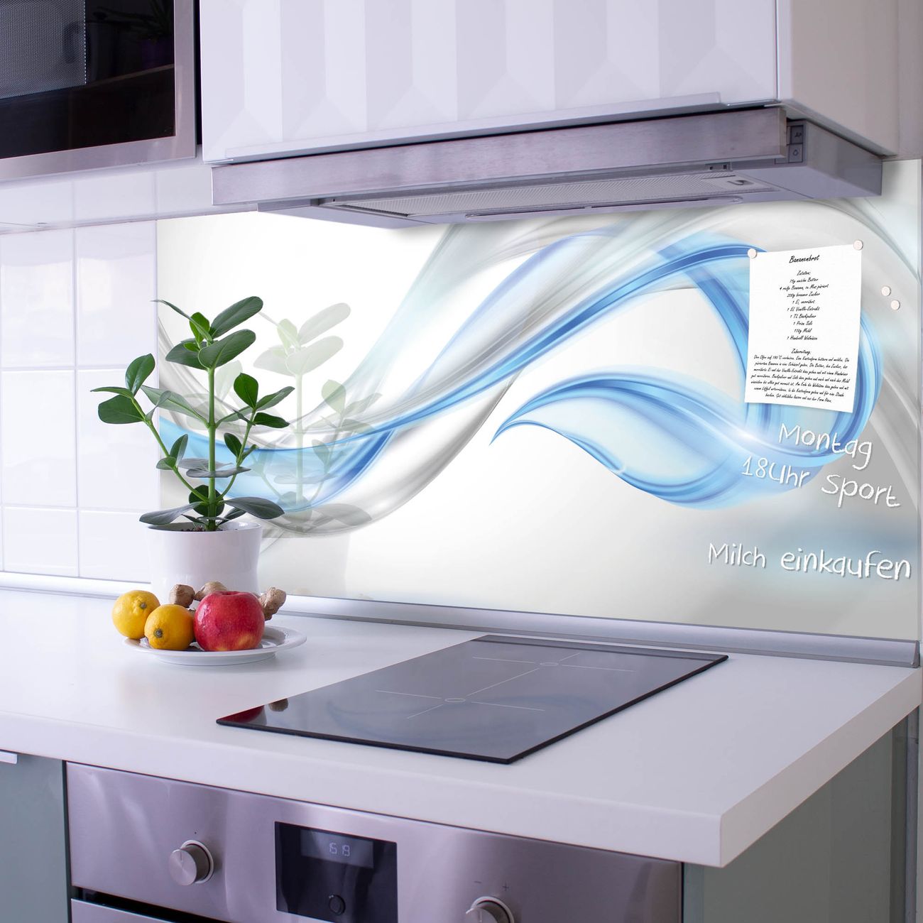 Die Küchenrückwand ist eine elegante Mehrzwecktafel: als Spritzschutz hinter Herd oder Waschbecken, hält Notizen wie ein Memoboard, ist beschreibbar mit Kreidestiften oder Whiteboard-Markern, sieht umwerfend als Glasbild aus. Sie besteht aus gehärtetem Glas, die Rückwand aus einem magnetischen Stahlblech. Durch die superflache Bauweise haben Sie die Wahl aus einer Vielzahl von Befestigungsmöglichkeiten. Sie können die Küchenrückwand mit einem Montagekleber superflach an die Wand kleben oder Sie wählen eines unserer passenden Befestigungssets, welches eine optimale Montage garantiert. Die Küchenrückwand besteht aus zertifiziertem Sicherheitsglas. Durch die mitgelieferten 4 Neodym-Magnete ist Ihre Glas Magnettafel sofort einsatzbereit.