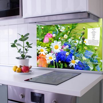 Die banjado Glas Küchenrückwand in verschiedenen Größen mit Motiv Blumenstrauß schützt Ihre Küchenfliesen vor Fettspritzern oder Wasserflecken. Der Spritzschutz ist gleichzeitig magnetisch und hält Ihre Rezepte oder Einkaufslisten. 4 Neodym-Magnete und 1 Kreidestift liegen bereits bei. Leuchtende Motive und hochwertiges Material machen den Spritzschutz zum Designobjekt. Das dekorative Glasbild gibt Ihrer Küche ein individuelles Erscheinungsbild. Abgerundete Kanten und Sicherheitsglas sorgen für einen sicheren Einsatz.