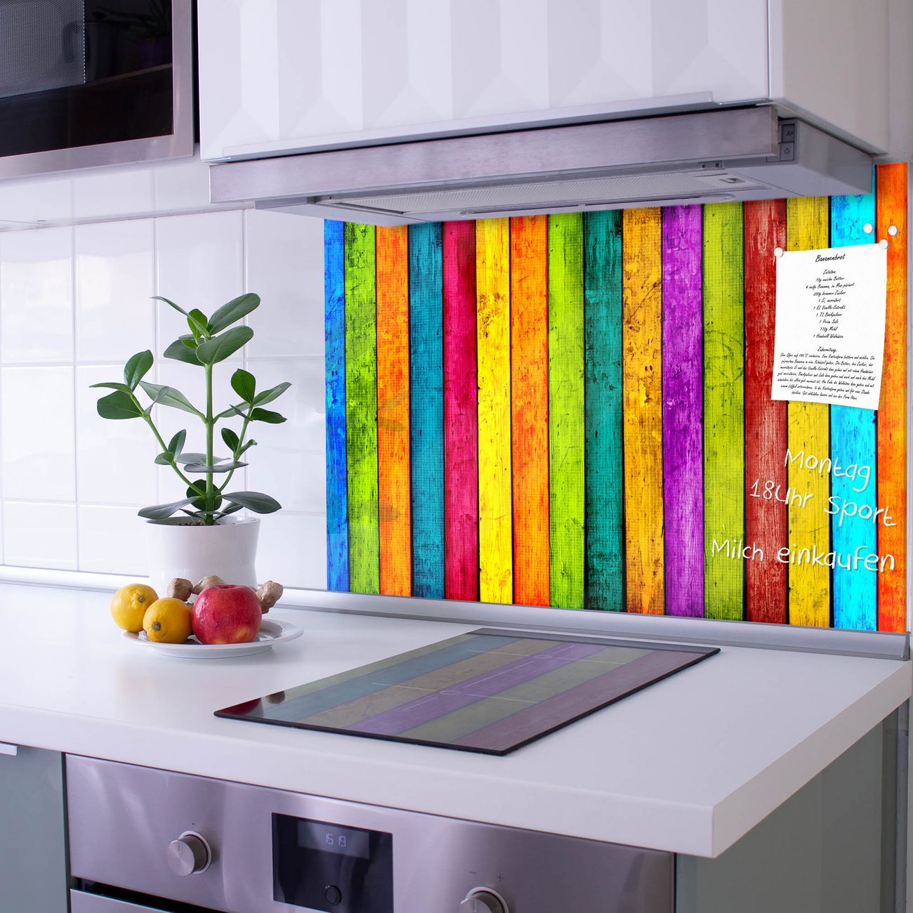 Die banjado Glas Küchenrückwand in verschiedenen Größen mit Motiv Bunte Holzlatten schützt Ihre Küchenfliesen vor Fettspritzern oder Wasserflecken. Der Spritzschutz ist gleichzeitig magnetisch und hält Ihre Rezepte oder Einkaufslisten. 4 Neodym-Magnete und 1 Kreidestift liegen bereits bei. Leuchtende Motive und hochwertiges Material machen den Spritzschutz zum Designobjekt. Das dekorative Glasbild gibt Ihrer Küche ein individuelles Erscheinungsbild. Abgerundete Kanten und Sicherheitsglas sorgen für einen sicheren Einsatz.