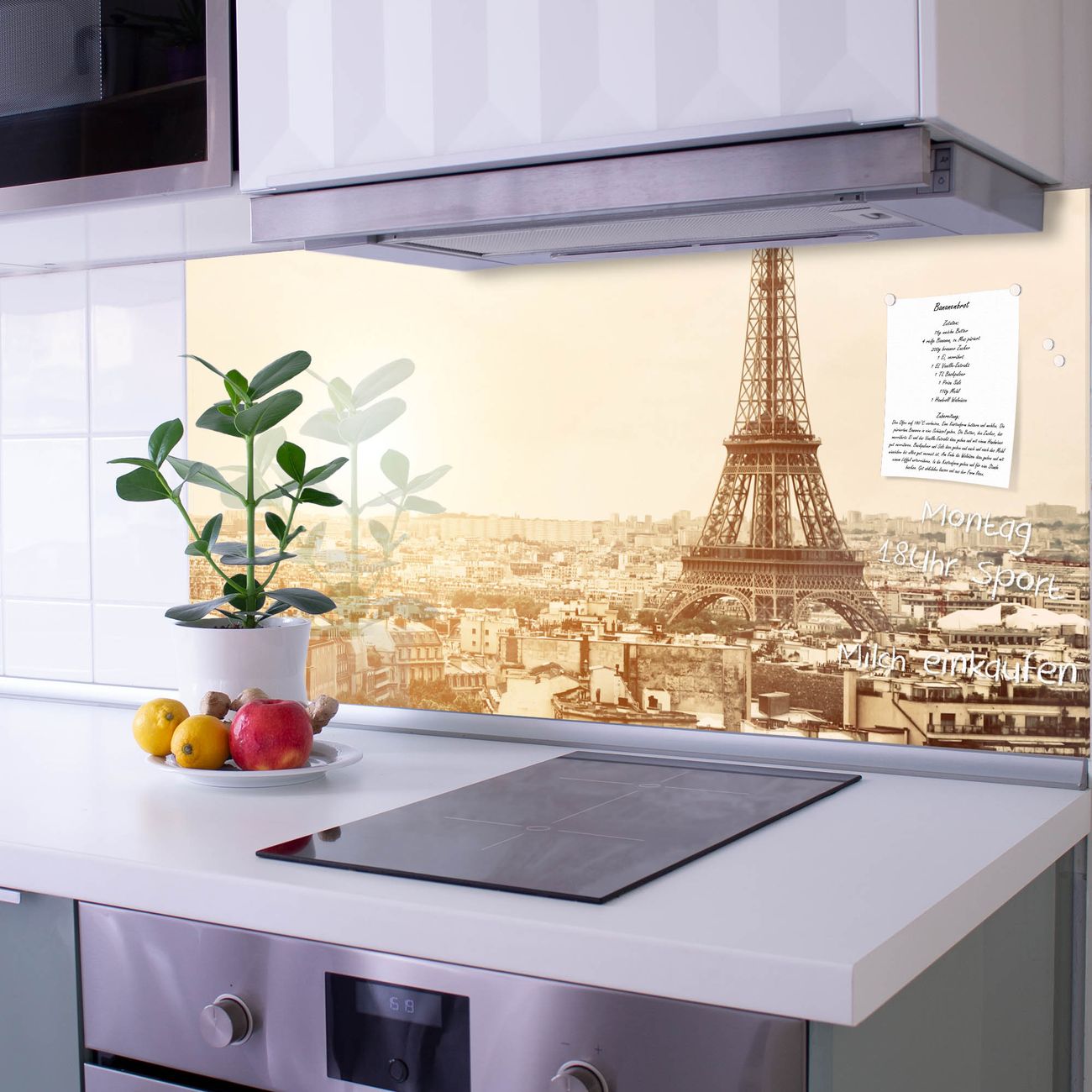 Die Küchenrückwand ist eine elegante Mehrzwecktafel: als Spritzschutz hinter Herd oder Waschbecken, hält Notizen wie ein Memoboard, ist beschreibbar mit Kreidestiften oder Whiteboard-Markern, sieht umwerfend als Glasbild aus. Sie besteht aus gehärtetem Glas, die Rückwand aus einem magnetischen Stahlblech. Durch die superflache Bauweise haben Sie die Wahl aus einer Vielzahl von Befestigungsmöglichkeiten. Sie können die Küchenrückwand mit einem Montagekleber superflach an die Wand kleben oder Sie wählen eines unserer passenden Befestigungssets, welches eine optimale Montage garantiert. Die Küchenrückwand besteht aus zertifiziertem Sicherheitsglas. Durch die mitgelieferten 4 Neodym-Magnete ist Ihre Glas Magnettafel sofort einsatzbereit.