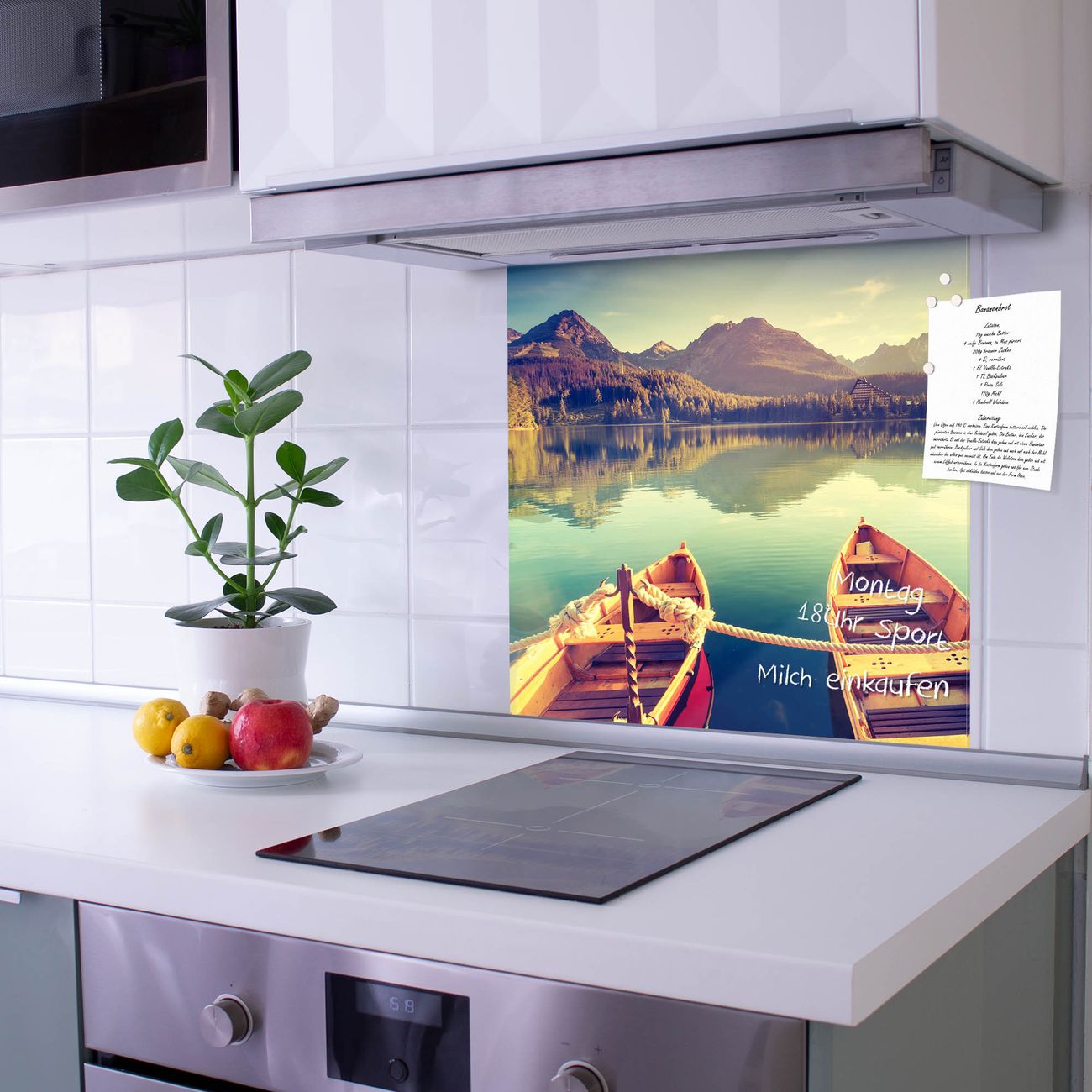 Die Küchenrückwand ist eine elegante Mehrzwecktafel: als Spritzschutz hinter Herd oder Waschbecken, hält Notizen wie ein Memoboard, ist beschreibbar mit Kreidestiften oder Whiteboard-Markern, sieht umwerfend als Glasbild aus. Sie besteht aus gehärtetem Glas, die Rückwand aus einem magnetischen Stahlblech. Durch die superflache Bauweise haben Sie die Wahl aus einer Vielzahl von Befestigungsmöglichkeiten. Sie können die Küchenrückwand mit einem Montagekleber superflach an die Wand kleben oder Sie wählen eines unserer passenden Befestigungssets, welches eine optimale Montage garantiert. Die Küchenrückwand besteht aus zertifiziertem Sicherheitsglas. Durch die mitgelieferten 4 Neodym-Magnete ist Ihre Glas Magnettafel sofort einsatzbereit.