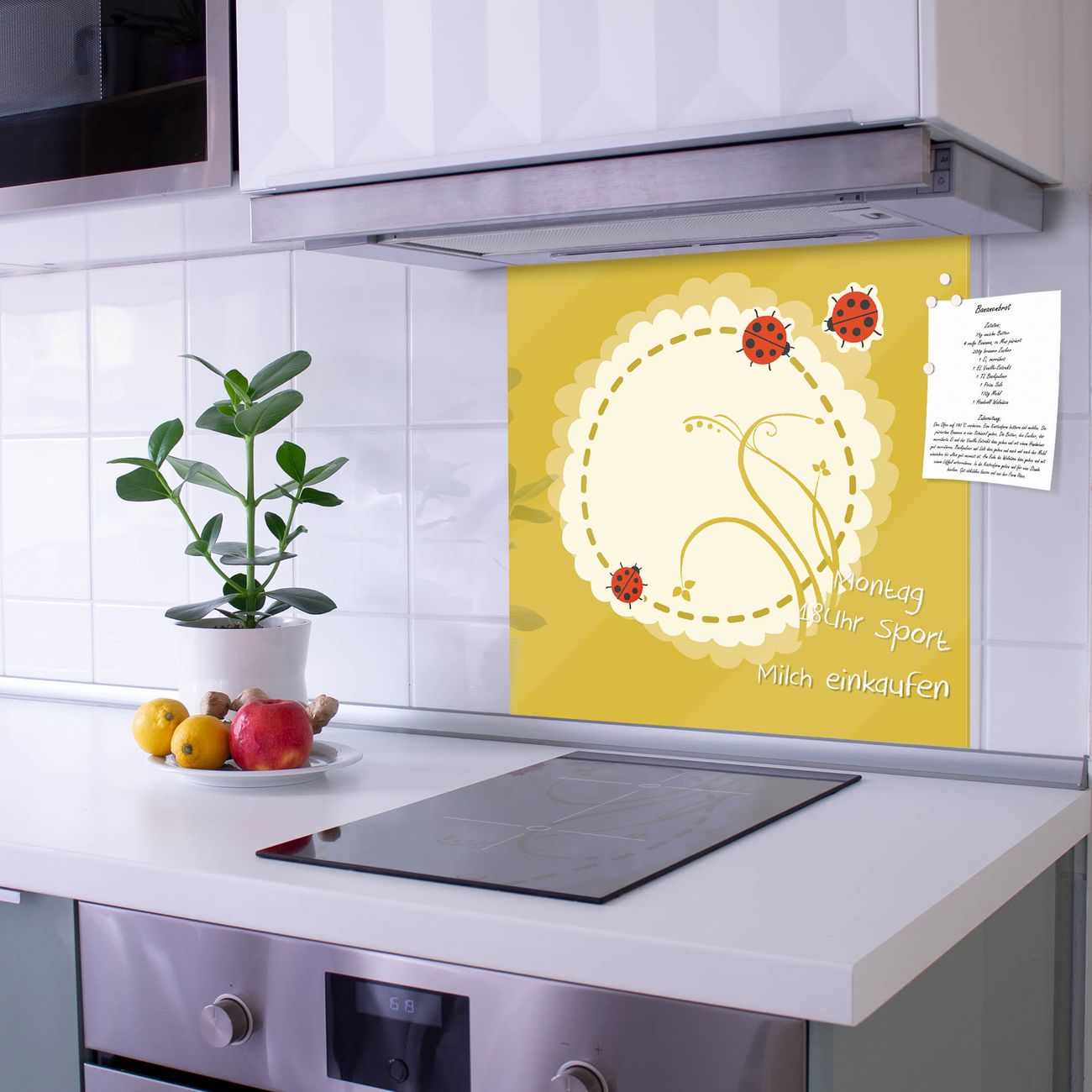 Die Küchenrückwand ist eine elegante Mehrzwecktafel: als Spritzschutz hinter Herd oder Waschbecken, hält Notizen wie ein Memoboard, ist beschreibbar mit Kreidestiften oder Whiteboard-Markern, sieht umwerfend als Glasbild aus. Sie besteht aus gehärtetem Glas, die Rückwand aus einem magnetischen Stahlblech. Durch die superflache Bauweise haben Sie die Wahl aus einer Vielzahl von Befestigungsmöglichkeiten. Sie können die Küchenrückwand mit einem Montagekleber superflach an die Wand kleben oder Sie wählen eines unserer passenden Befestigungssets, welches eine optimale Montage garantiert. Die Küchenrückwand besteht aus zertifiziertem Sicherheitsglas. Durch die mitgelieferten 4 Neodym-Magnete ist Ihre Glas Magnettafel sofort einsatzbereit.