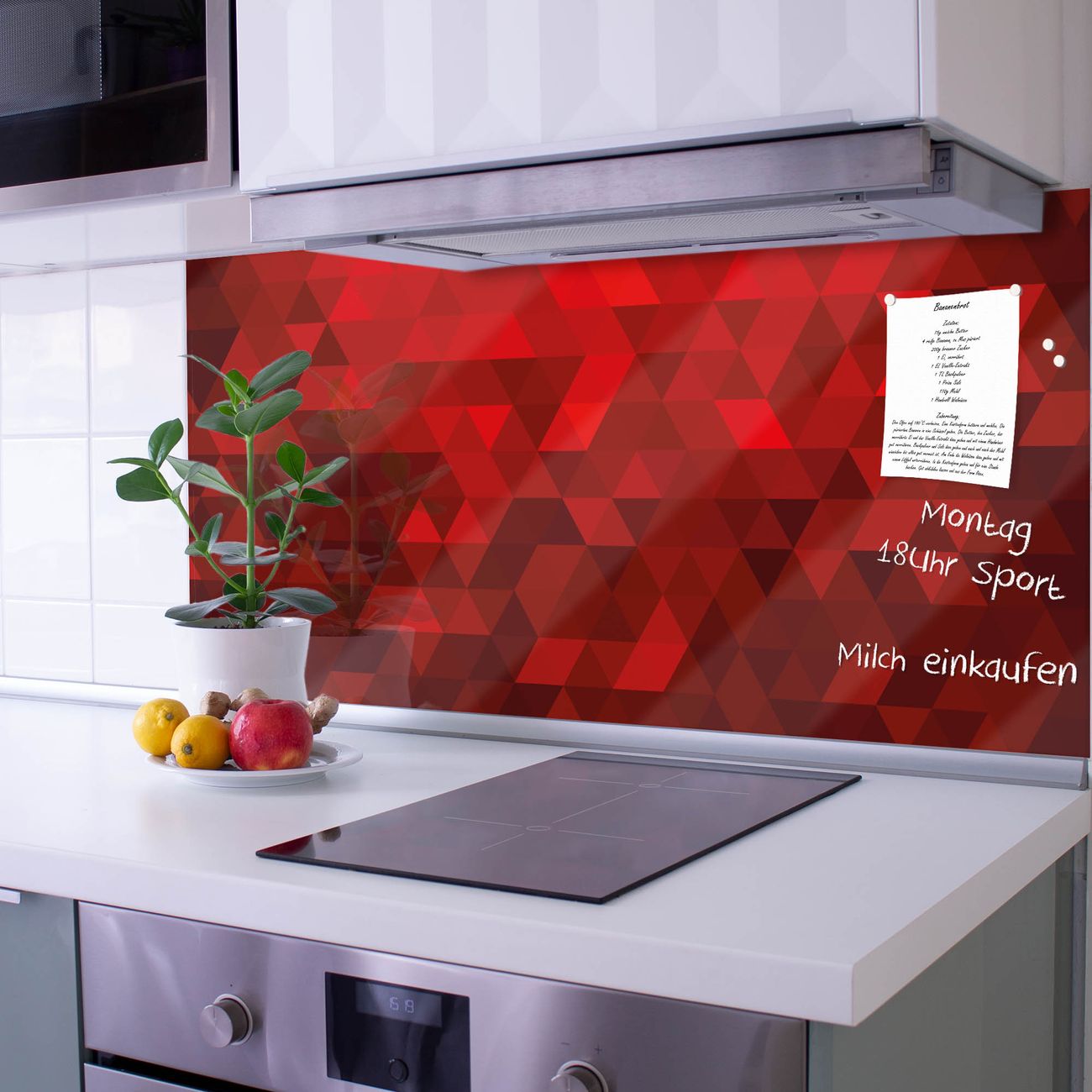 Die banjado Glas Küchenrückwand in verschiedenen Größen mit Motiv Dreiecke Rot schützt Ihre Küchenfliesen vor Fettspritzern oder Wasserflecken. Der Spritzschutz ist gleichzeitig magnetisch und hält Ihre Rezepte oder Einkaufslisten. 4 Neodym-Magnete und 1 Kreidestift liegen bereits bei. Leuchtende Motive und hochwertiges Material machen den Spritzschutz zum Designobjekt. Das dekorative Glasbild gibt Ihrer Küche ein individuelles Erscheinungsbild. Abgerundete Kanten und Sicherheitsglas sorgen für einen sicheren Einsatz.