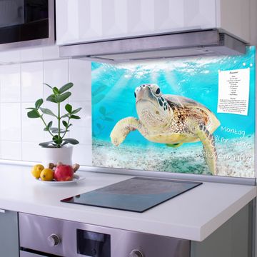 Die Küchenrückwand ist eine elegante Mehrzwecktafel: als Spritzschutz hinter Herd oder Waschbecken, hält Notizen wie ein Memoboard, ist beschreibbar mit Kreidestiften oder Whiteboard-Markern, sieht umwerfend als Glasbild aus. Sie besteht aus gehärtetem Glas, die Rückwand aus einem magnetischen Stahlblech. Durch die superflache Bauweise haben Sie die Wahl aus einer Vielzahl von Befestigungsmöglichkeiten. Sie können die Küchenrückwand mit einem Montagekleber superflach an die Wand kleben oder Sie wählen eines unserer passenden Befestigungssets, welches eine optimale Montage garantiert. Die Küchenrückwand besteht aus zertifiziertem Sicherheitsglas. Durch die mitgelieferten 4 Neodym-Magnete ist Ihre Glas Magnettafel sofort einsatzbereit.