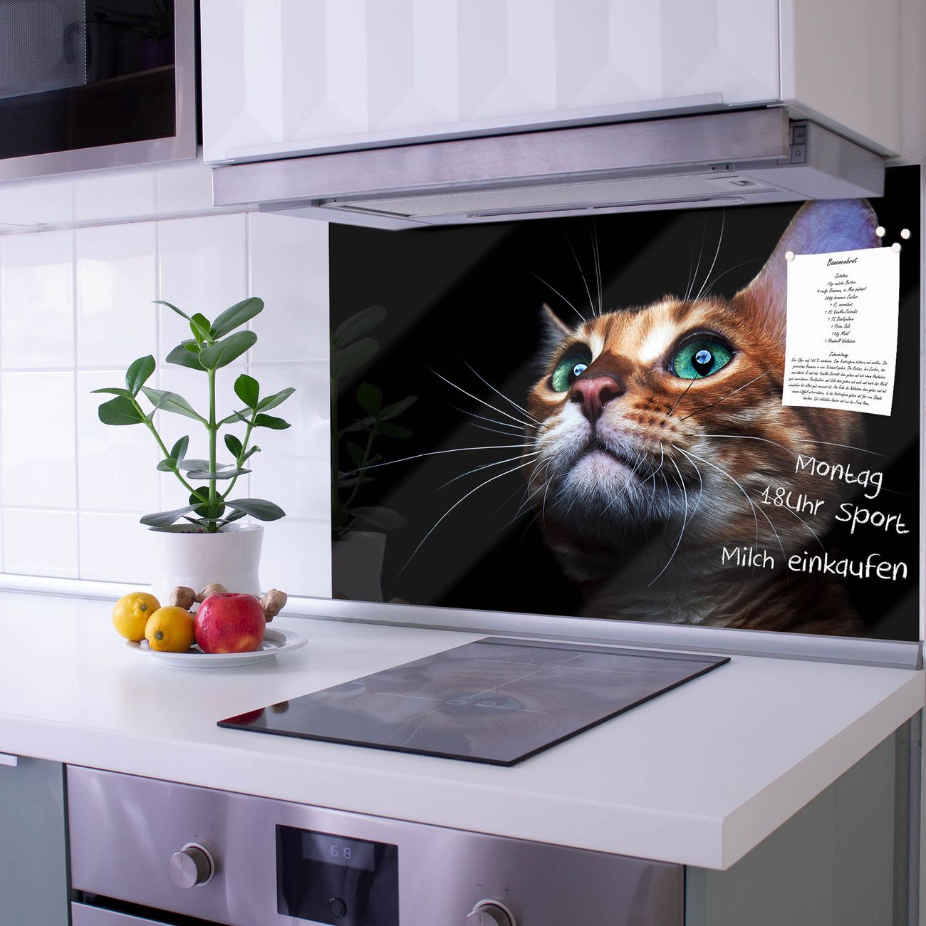 Die Küchenrückwand ist eine elegante Mehrzwecktafel: als Spritzschutz hinter Herd oder Waschbecken, hält Notizen wie ein Memoboard, ist beschreibbar mit Kreidestiften oder Whiteboard-Markern, sieht umwerfend als Glasbild aus. Sie besteht aus gehärtetem Glas, die Rückwand aus einem magnetischen Stahlblech. Durch die superflache Bauweise haben Sie die Wahl aus einer Vielzahl von Befestigungsmöglichkeiten. Sie können die Küchenrückwand mit einem Montagekleber superflach an die Wand kleben oder Sie wählen eines unserer passenden Befestigungssets, welches eine optimale Montage garantiert. Die Küchenrückwand besteht aus zertifiziertem Sicherheitsglas. Durch die mitgelieferten 4 Neodym-Magnete ist Ihre Glas Magnettafel sofort einsatzbereit.