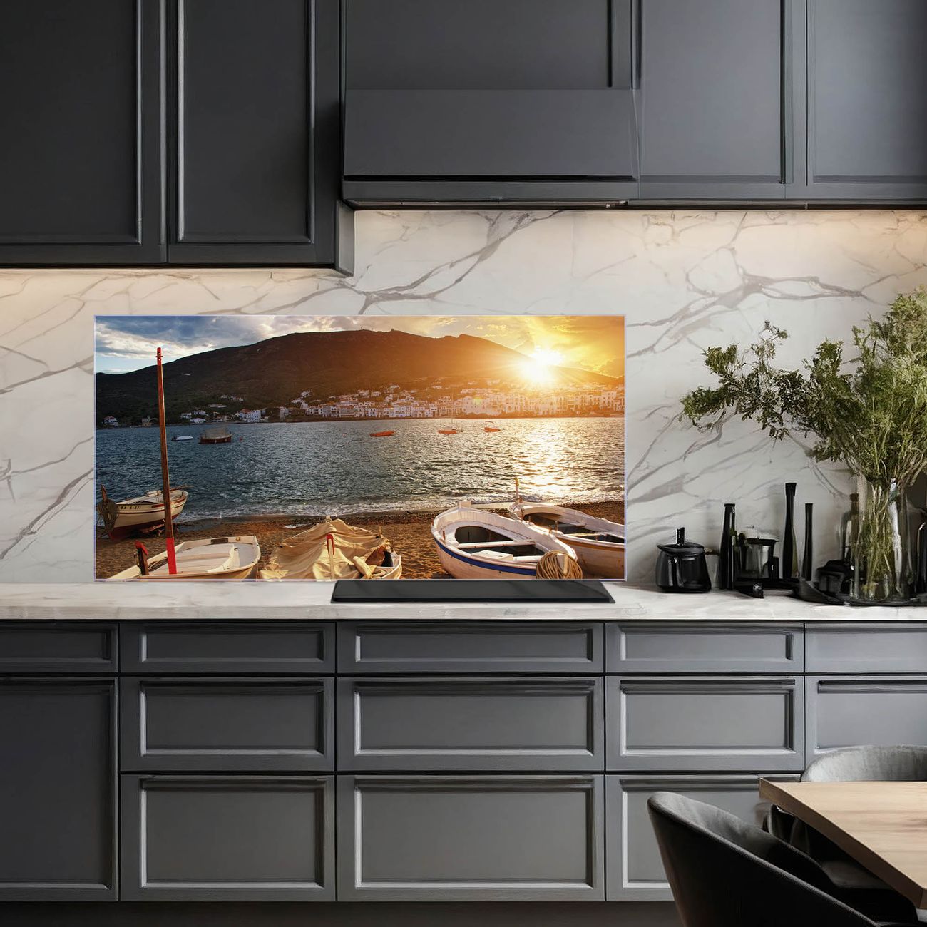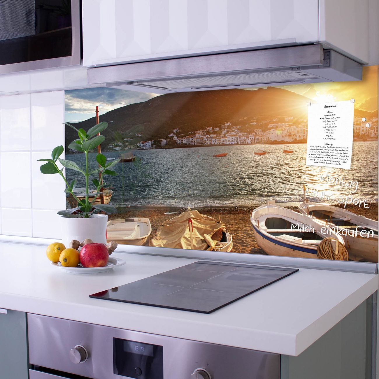 Die banjado Glas Küchenrückwand in verschiedenen Größen mit Motiv Fischerboote schützt Ihre Küchenfliesen vor Fettspritzern oder Wasserflecken. Der Spritzschutz ist gleichzeitig magnetisch und hält Ihre Rezepte oder Einkaufslisten. 4 Neodym-Magnete und 1 Kreidestift liegen bereits bei. Leuchtende Motive und hochwertiges Material machen den Spritzschutz zum Designobjekt. Das dekorative Glasbild gibt Ihrer Küche ein individuelles Erscheinungsbild. Abgerundete Kanten und Sicherheitsglas sorgen für einen sicheren Einsatz.